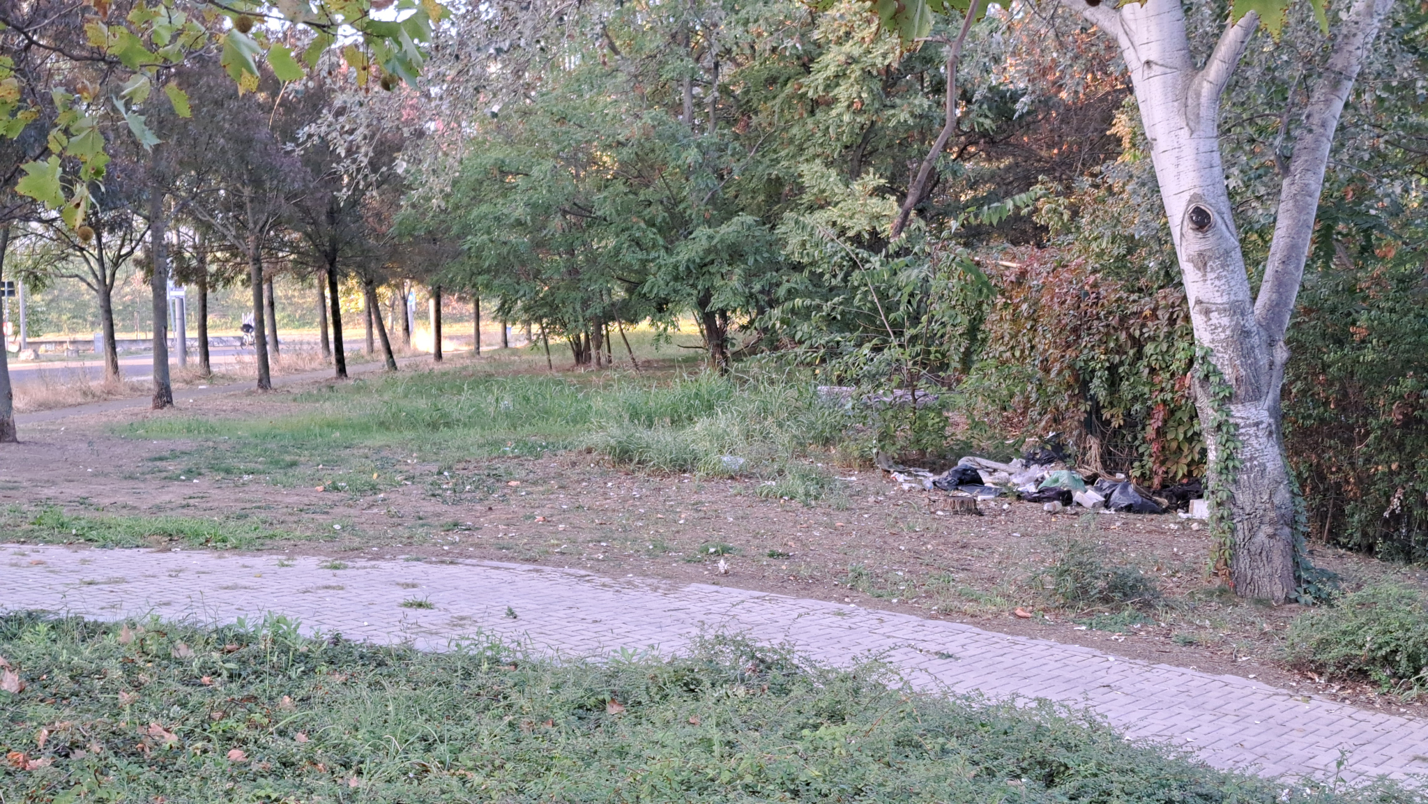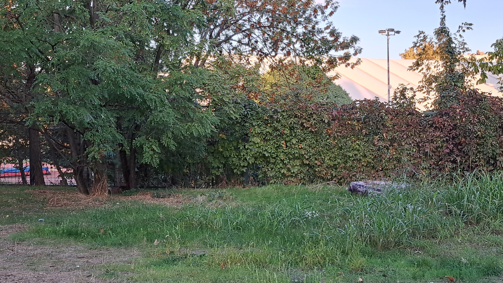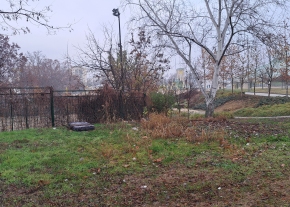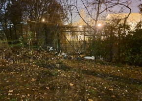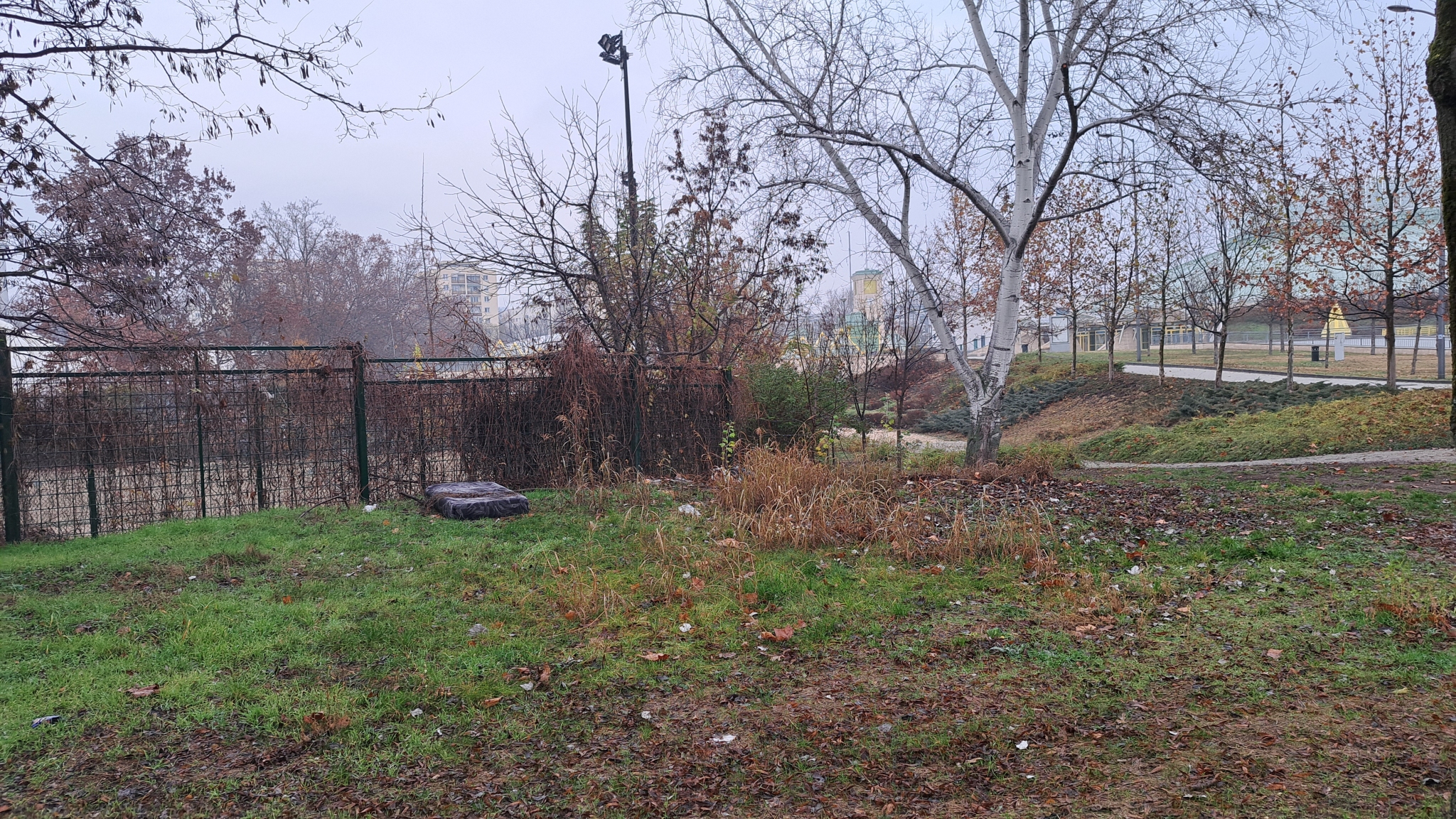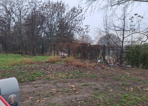 A Hevesy György úton a sporttelep kerítése mellett szemétkupac, kidobott matrac, a kórnyékén a zöldterület is tele szeméttel.