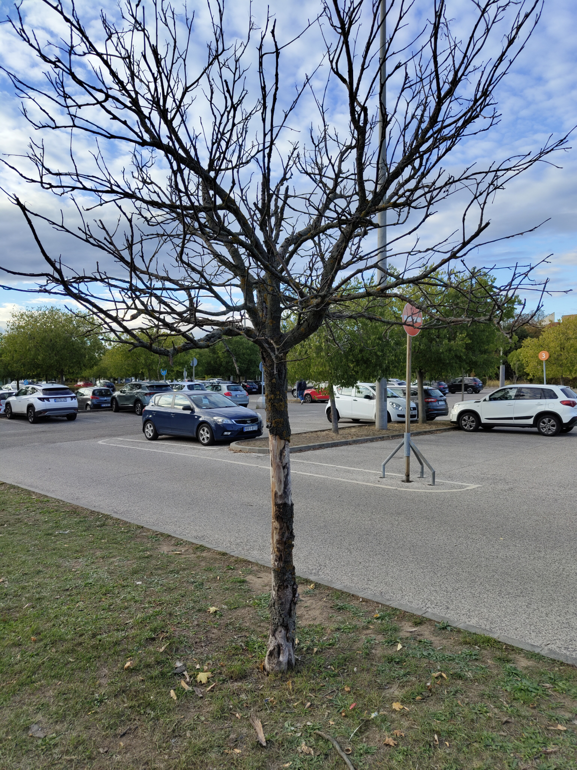 Egy teljesen kidőlt és egy még álló de halott fa a parkolóban