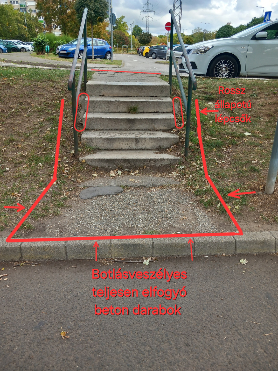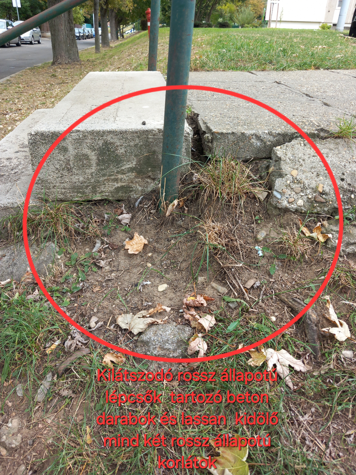 A Tavas utca 2 szám alatt a Lépcsők rossz állapotban van, illetve a beton darabok teljesen elfogynak botlásveszély van, valamint a Lépcsők tartozó beton darabok hullanak helyérő, mind két korlát lassan kidöl helyéről köztük Lépcsők és kocka között nagyobb rések látható akár balesetveszélyessé válhat