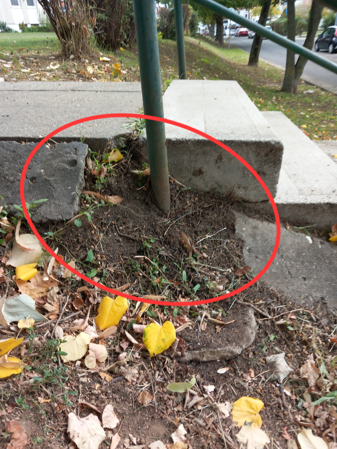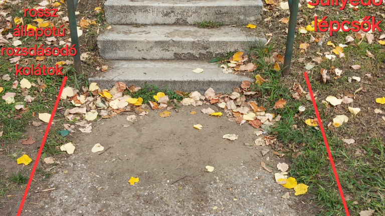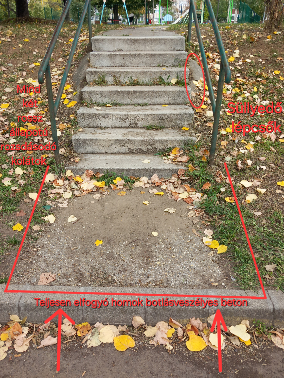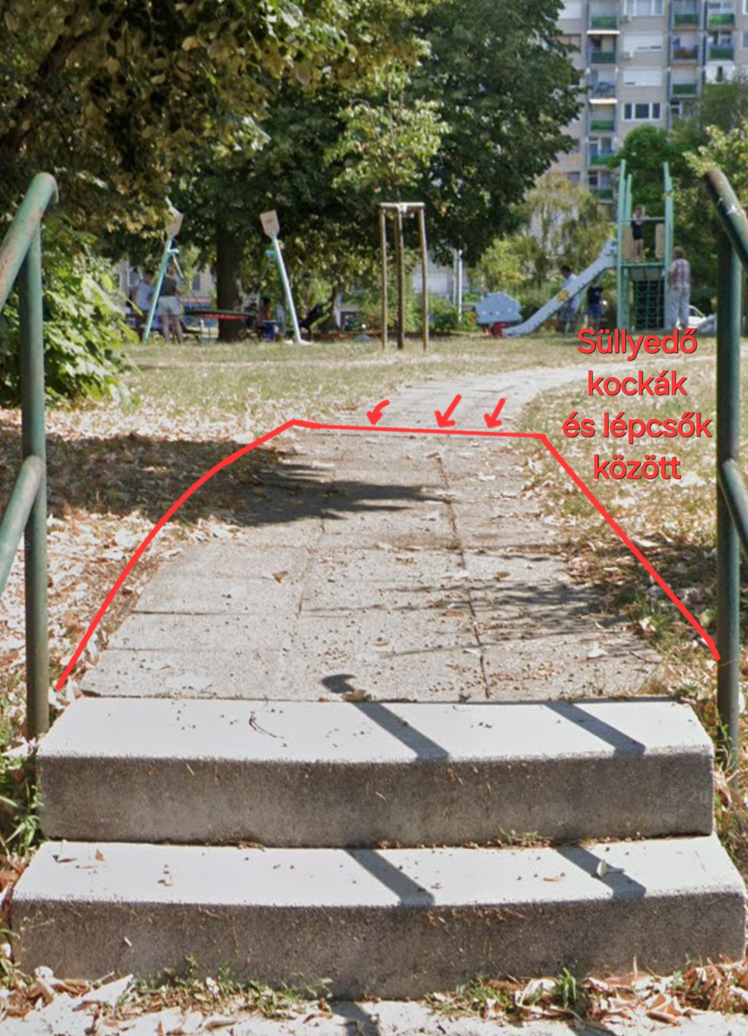 A Sütőde utca 4 es szám alatt közvetlenül idesüs óvodánál, Tavas utcai játszótér felé a Lépcsők megsüllyedések vannak köztük pirossal jelölve a kockák és lépcsők között megsüllyednek, kilátszanak lépcsők és kockák között beton darabok helyükrők, illetve lépcsővel szemben a beton teljesen elfogy már csak földes homokos betonzata láthatóak ami lassan használhatatlanná válhat, valamint a mindkét korlátok rossz állapotban vannak