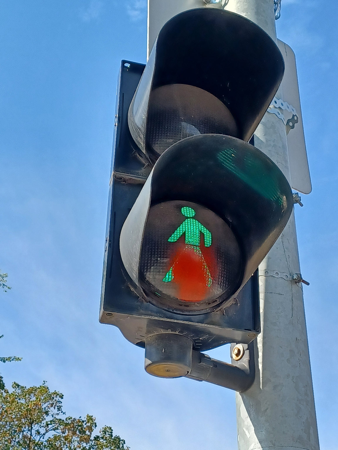 Kelemen László utcai 61-es villamos megállóban a sínnél piros festékkel fújták be a zöld jelzést.