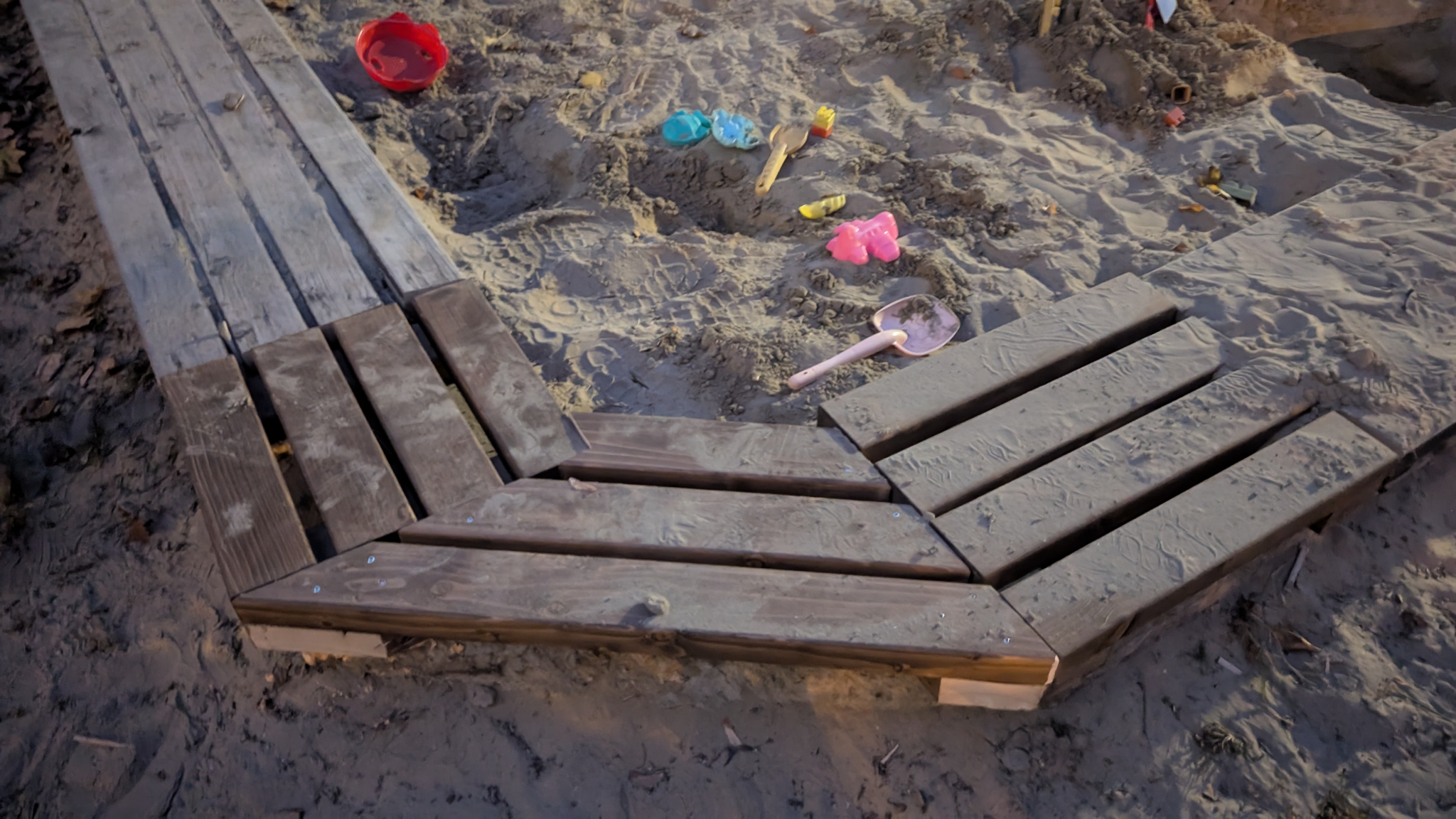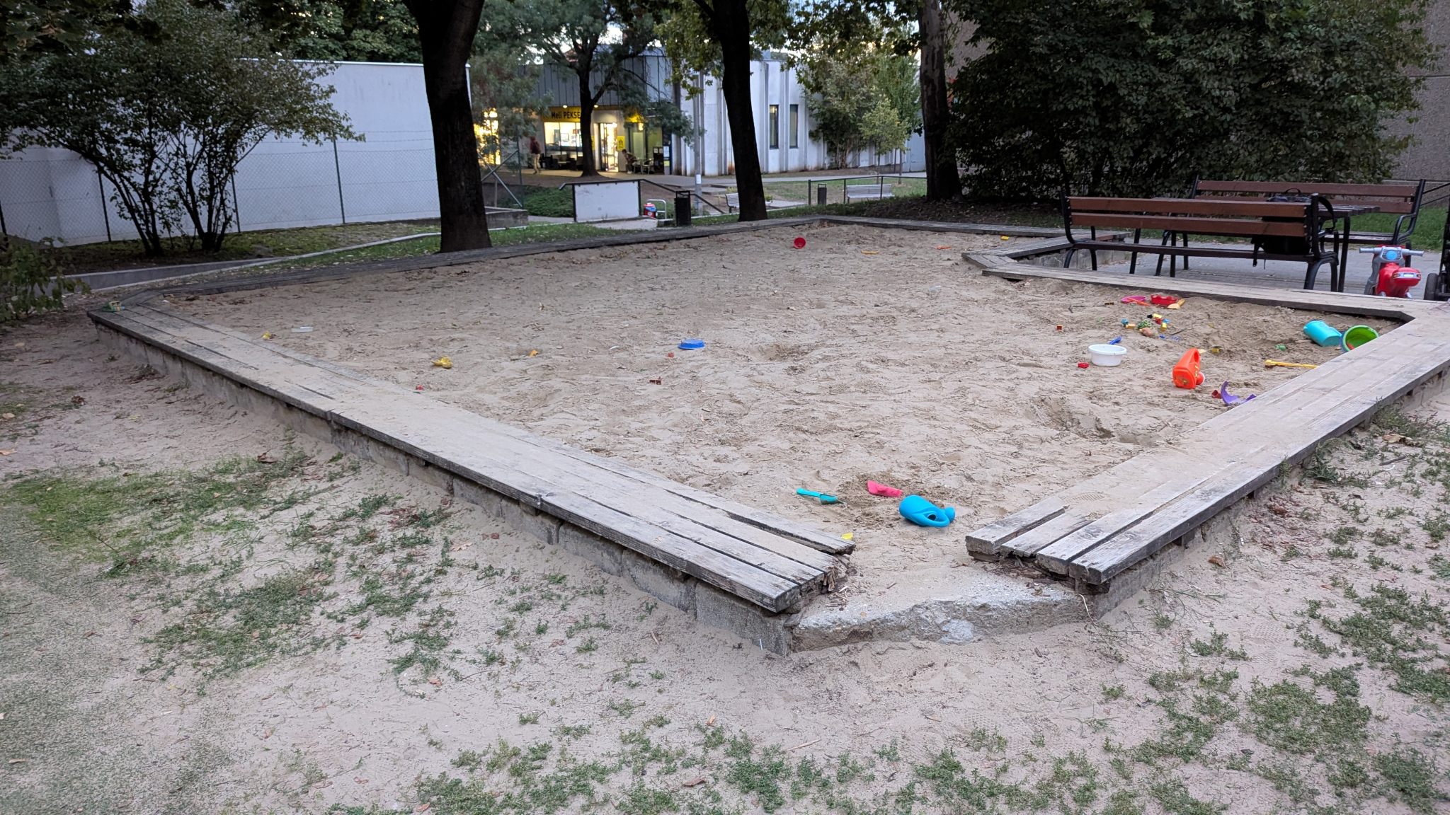 Szilánkosra korhadt a homokozó szegélye, a sarokeleme pedig eltűnt a Posta és a Rossmann által közbezárt kis játszótéren.