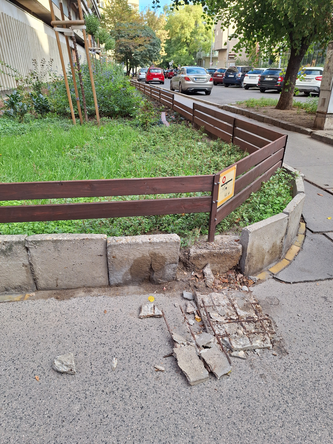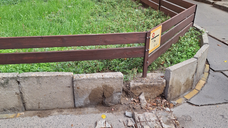 A Batthyány utca - Gyorskocsi utca sarkán a kiemelt ágyás szegélye kitörött és kiborult a járdára, meg kell javítani.