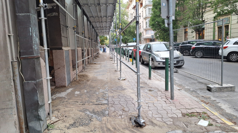 A Pauler utcában egy épületfelújítási állvány oszlopai a kerékpársávon belül állnak, ami a kerékpársávot nagyon leszűkíti és ezáltal kerékpárúton való közlekedést veszélyessé teszi.