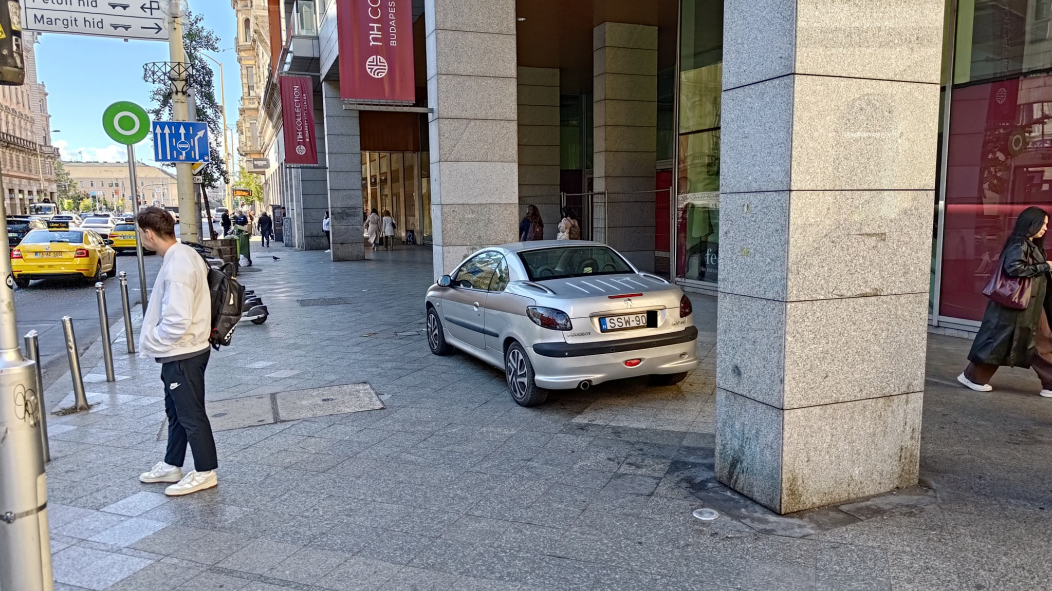 A Rákóczi út - Osvát utca sarok közelében mindennapos a járdán parkolás az árkádok alatt.