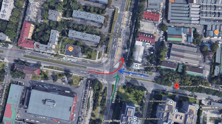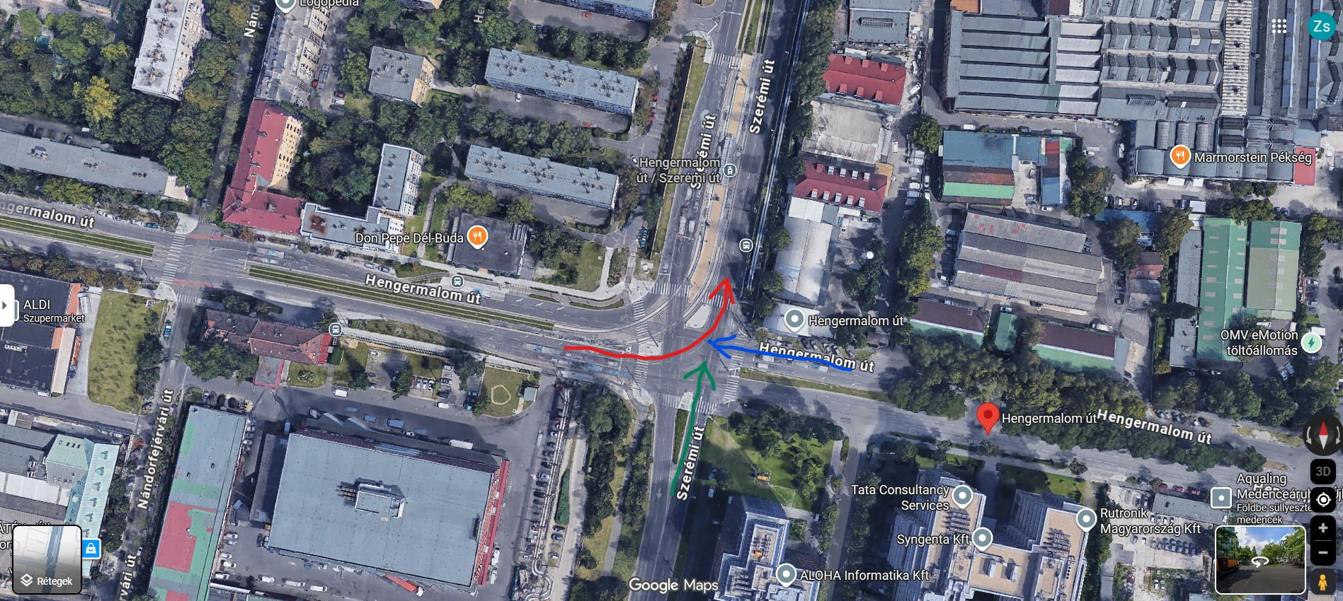 Különösen a Fehérvári út felől érkező és balra a Szerémi útra rákanyarodók voltak hajlamosak beszorulni (piros nyíl), akadályozva a Hengermalom úti kereszt irányú forgalmat, amely nem tud haladni a kanyarban beragadóktól. (kék nyíl)