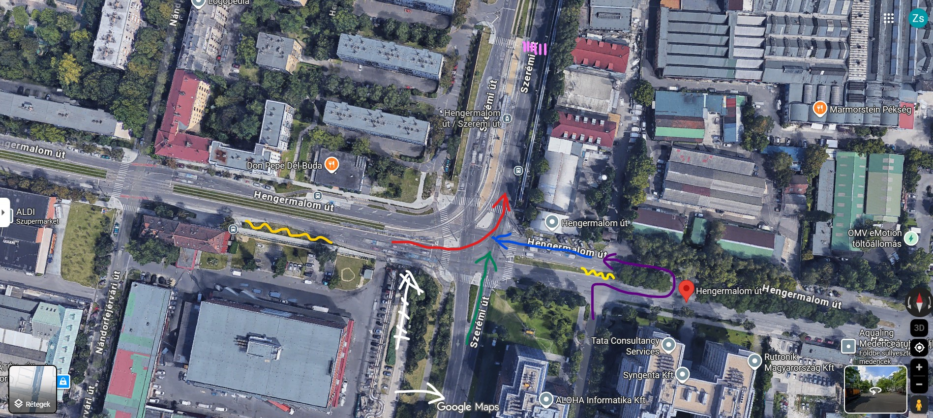 Illetve a villamos járdasziget jobb felső sarkánál az újonnan épült irodaházhoz építettek egy zebrát is (rózsaszín csíkok), ami jelenlegi tapasztalatok alapján nincs összehangolva a Szerémi úti egyenes forgalommal és éppen pirosra vált. Itt a gyalogos áthaladási igény jelzését nyomógombos megoldással is el tudnám képzeni.