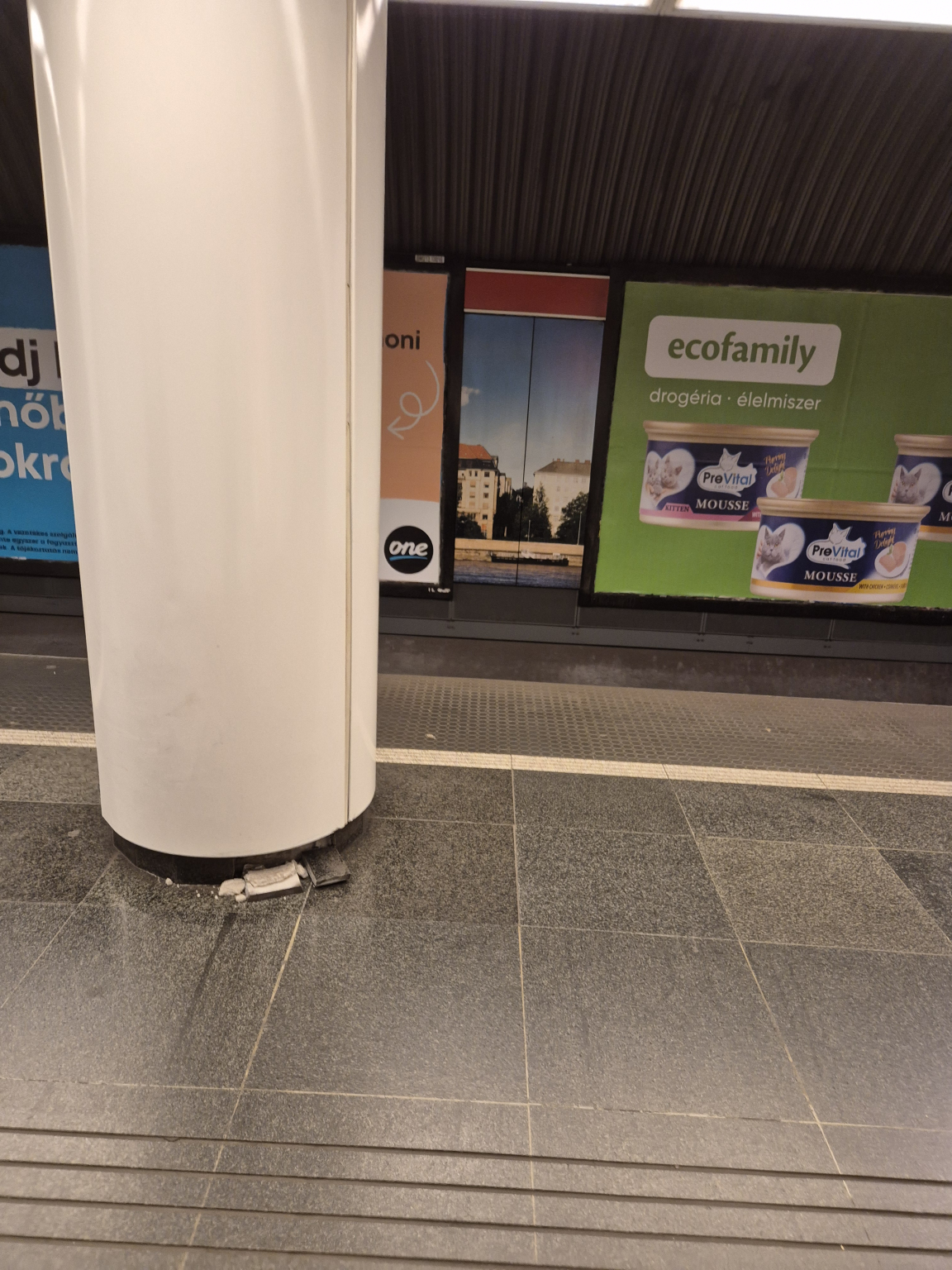 A Batthyány téri m2 megálló végén az egyik tartóoszlop burkolata elkezdett omladozni a peron végén (Örs felé vezető irány). Kérem legyenek kedvesek javítsák ki, amígy még ott vannak a csempék. Előre is köszönöm