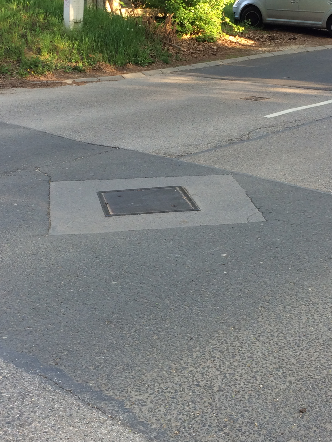 Jelzett helyszínen lévő fedlap nem jó állapotú, már mozog, nem tartja az út síkját. Körülötte az út nem egyenletes, nyomvonalon van, üti a futóművet. Látványosan más az aszfalt a fedlap körül, a közútkezelő vélhetően az üzemeltető hatáskörének érezte ezt a javítást.