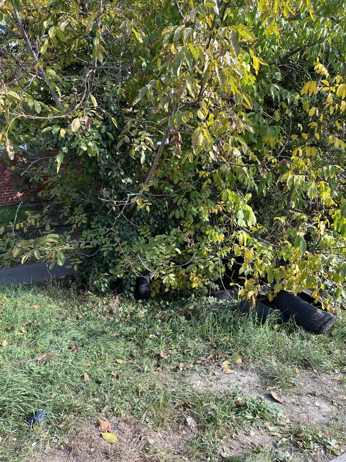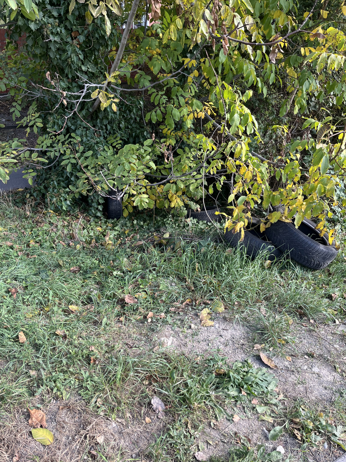 A Szent István utca saroknál szemét es eldobott gumiabroncsok vannak a bokor alatt
