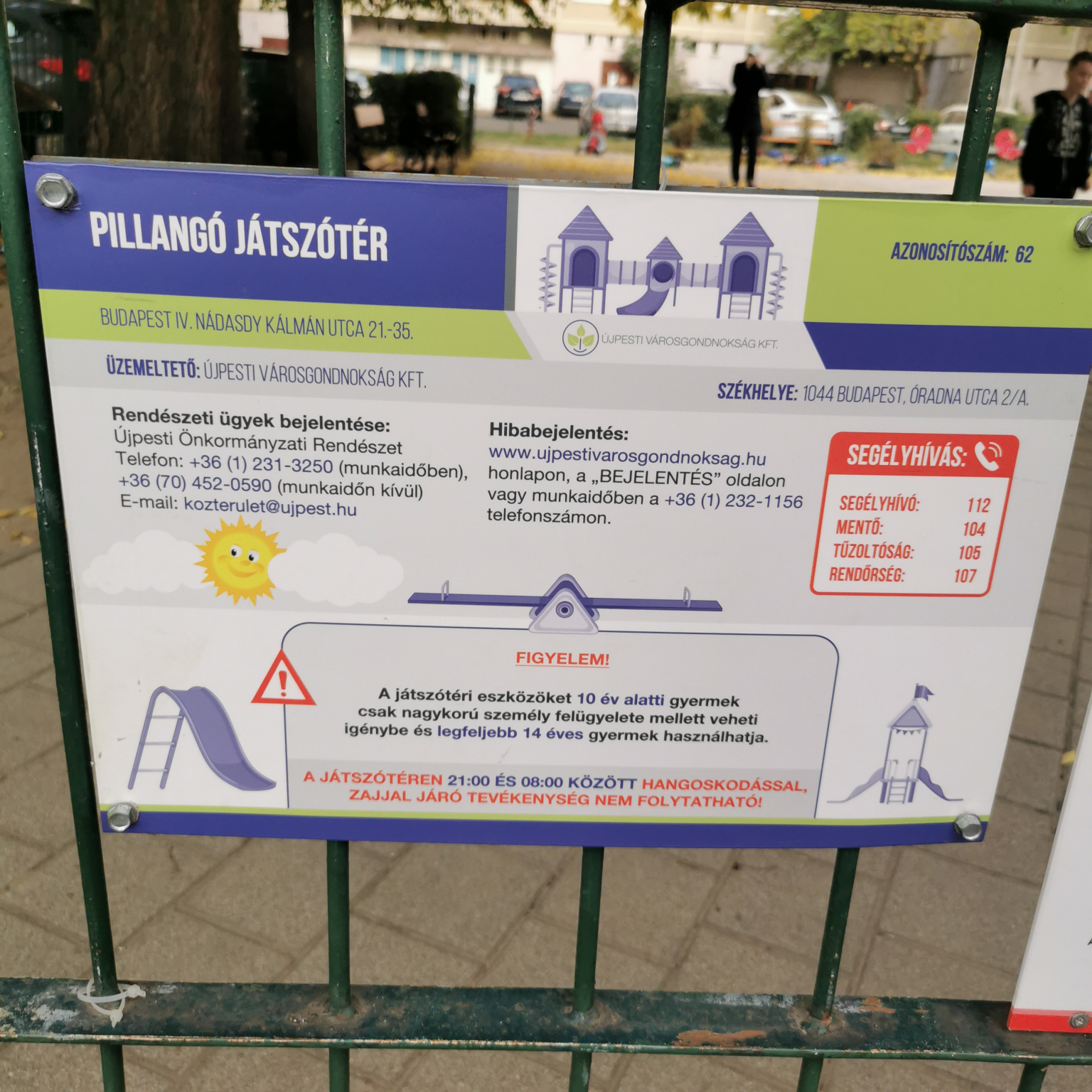 A Nádasdy Kálmán utcában lévő Pillangó játszótéren a kerítés megrongálódott és így nagyon balesetveszélyes,mert simán felnyársal egy gyereket ha nekiszalad.
