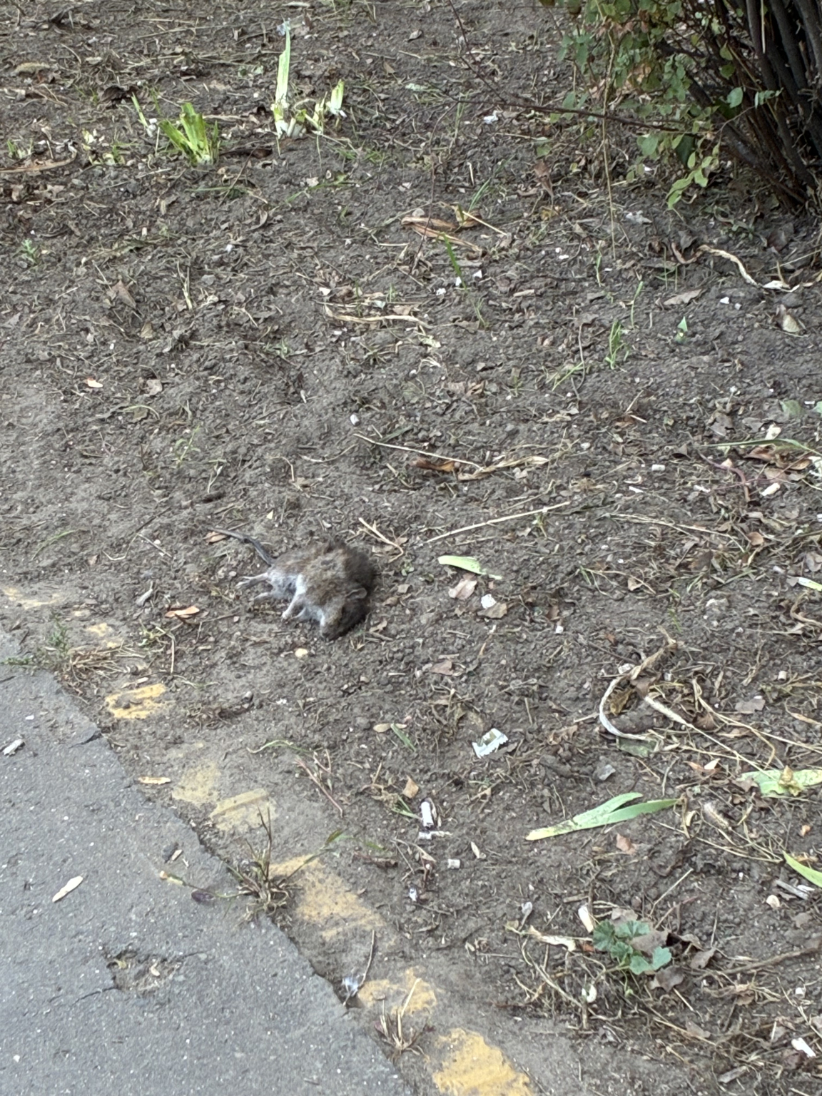 Döglött patkány van a Szentmihályi út 20-22 előtti részen, a 20-as blokk előtt.
