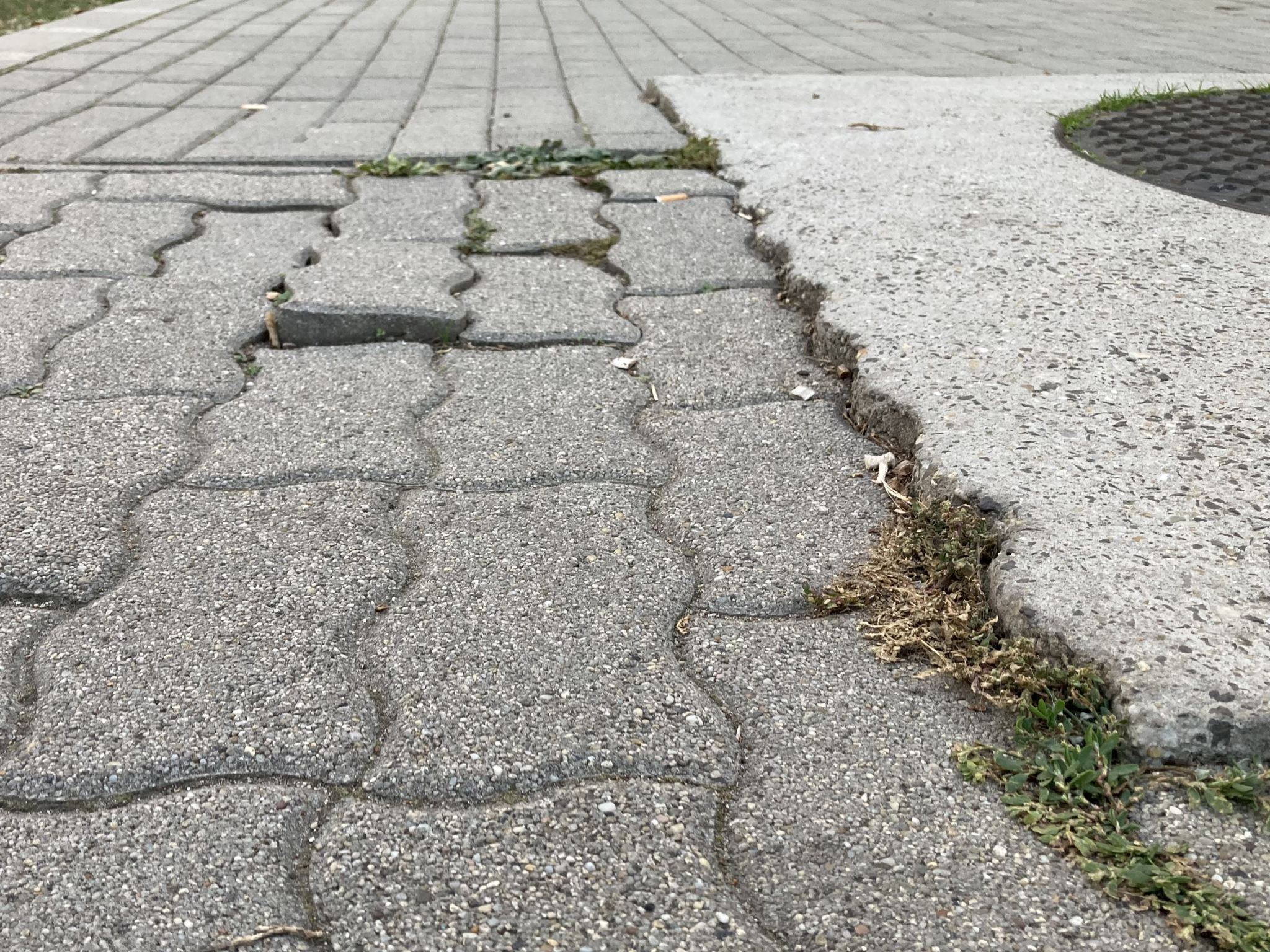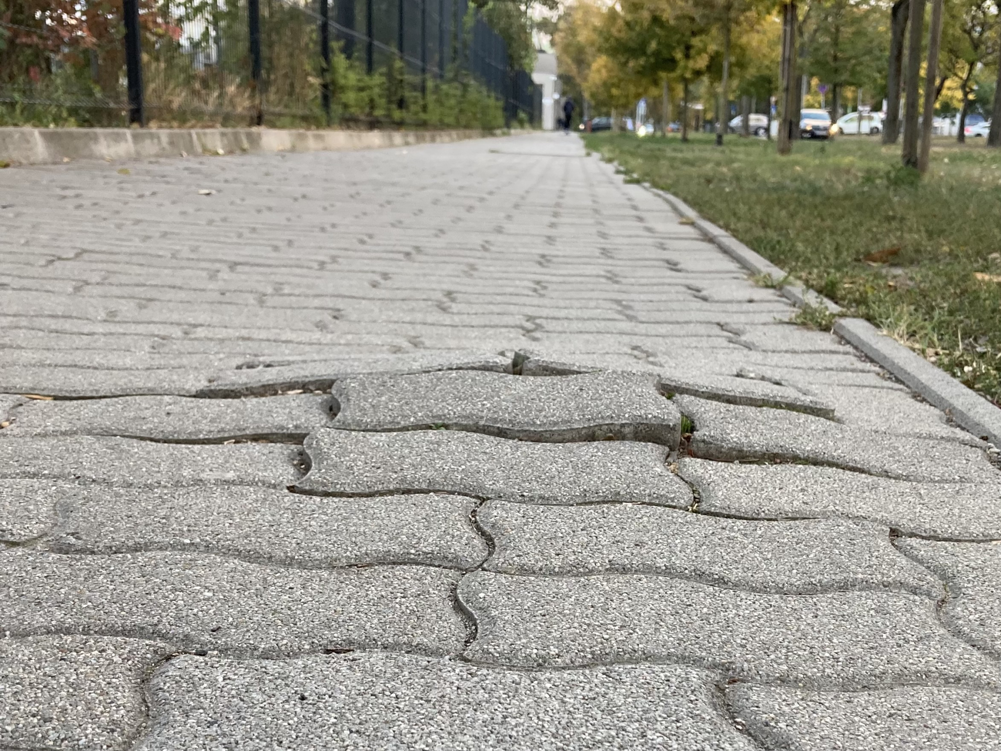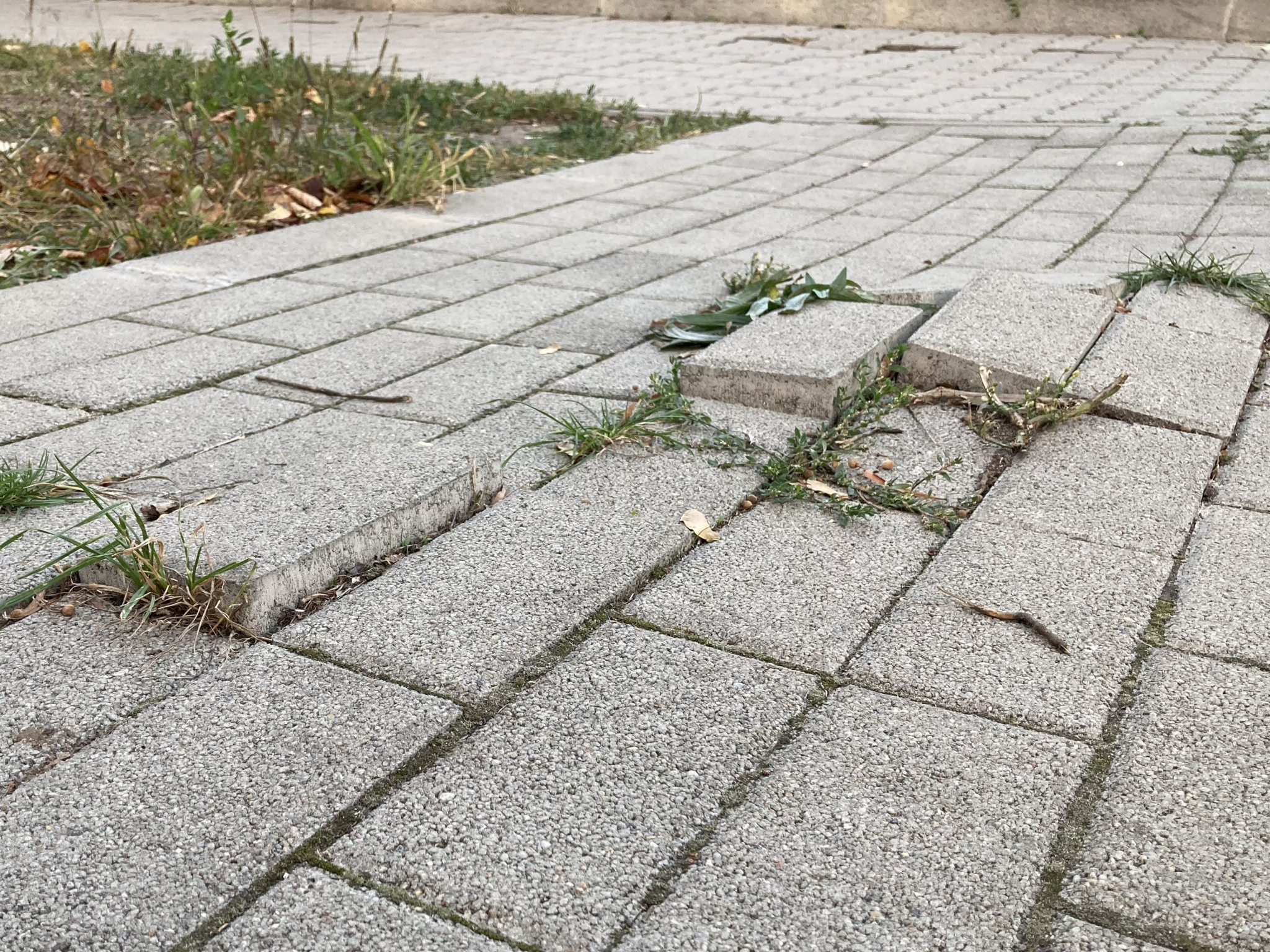 A járda kövezete több helyen megsüllyedt, illetve a fák gyökerei a köveket felnyomták. Balesetveszélyes.