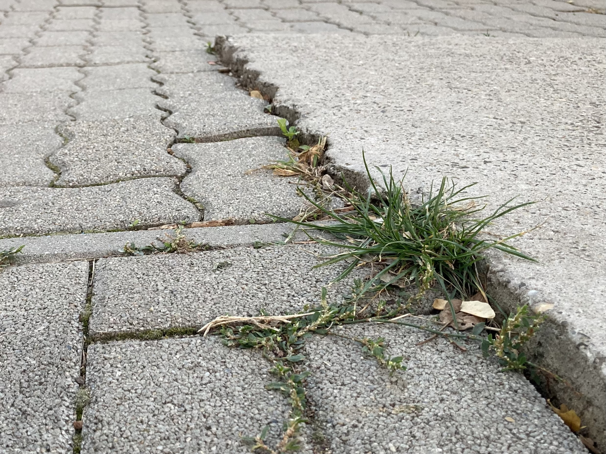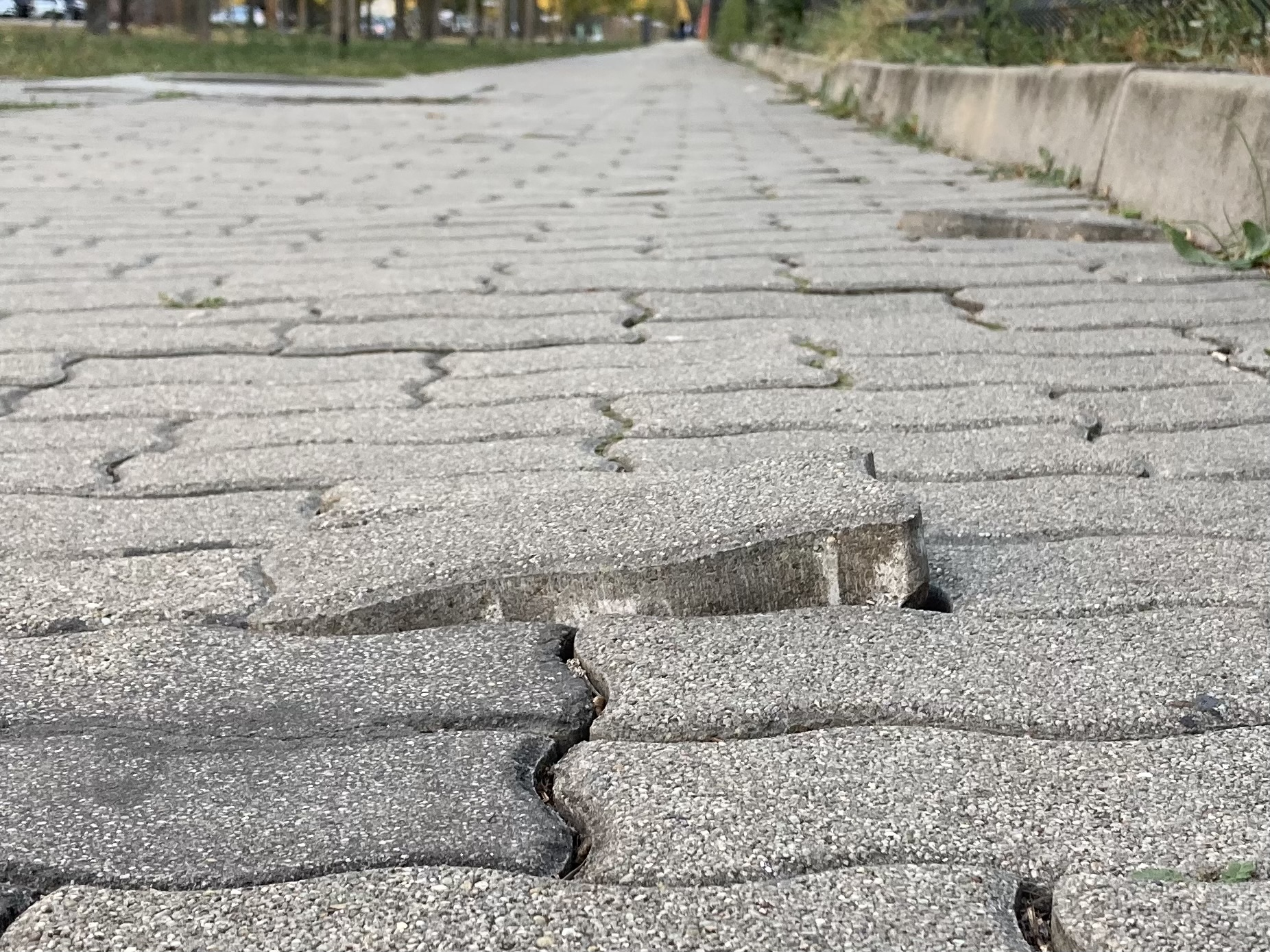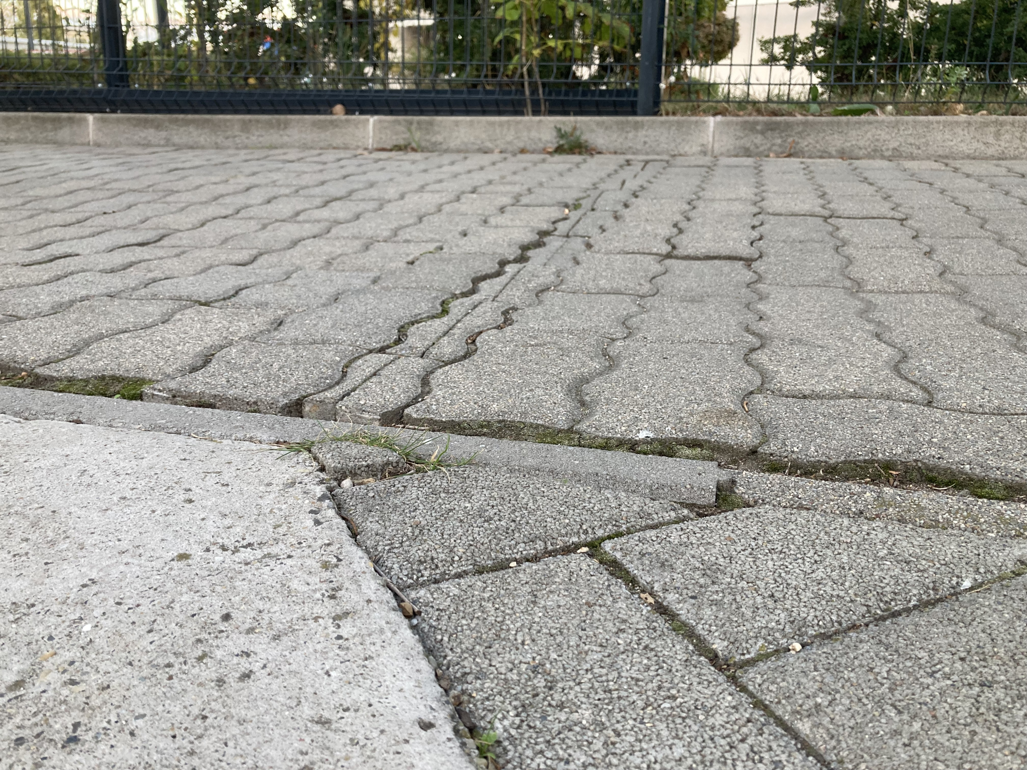 A járda kövezete több helyen megsüllyedt, illetve a fák gyökerei a köveket felnyomták. Balesetveszélyes.
