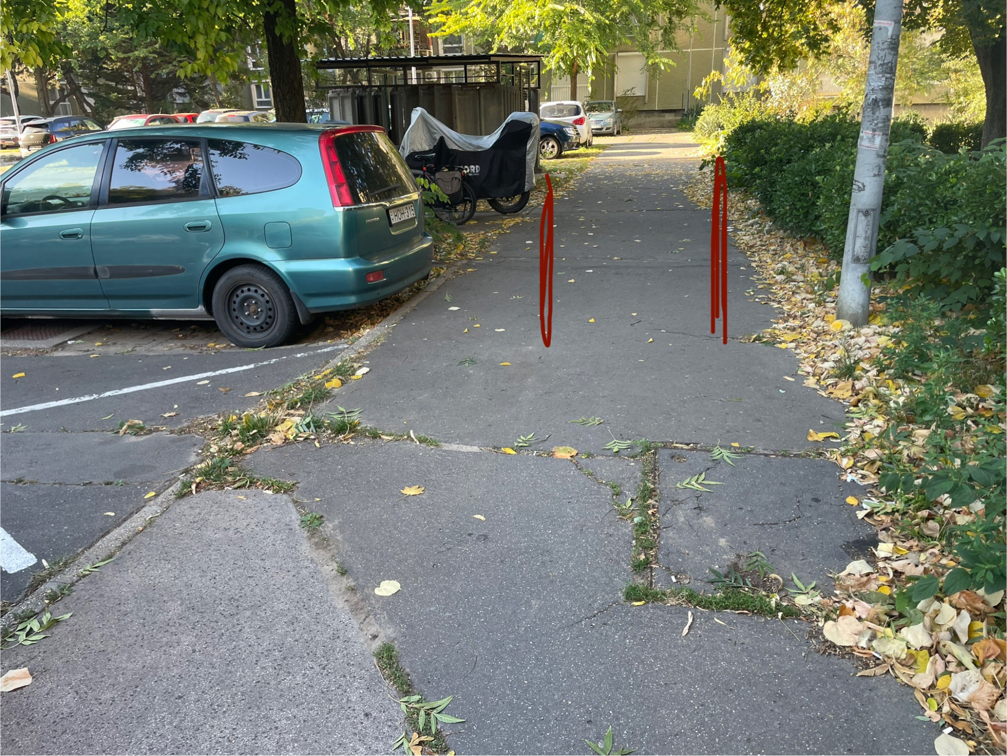 Az autók folyamatosan a járdán hajtanak fel, szükséges lenne a gyalogosok védelme miatt a pillérek elhelyezése a járdán hogy ne lehessen körbe menni így védve és lassítás rá kényszeríteni a kocsikat