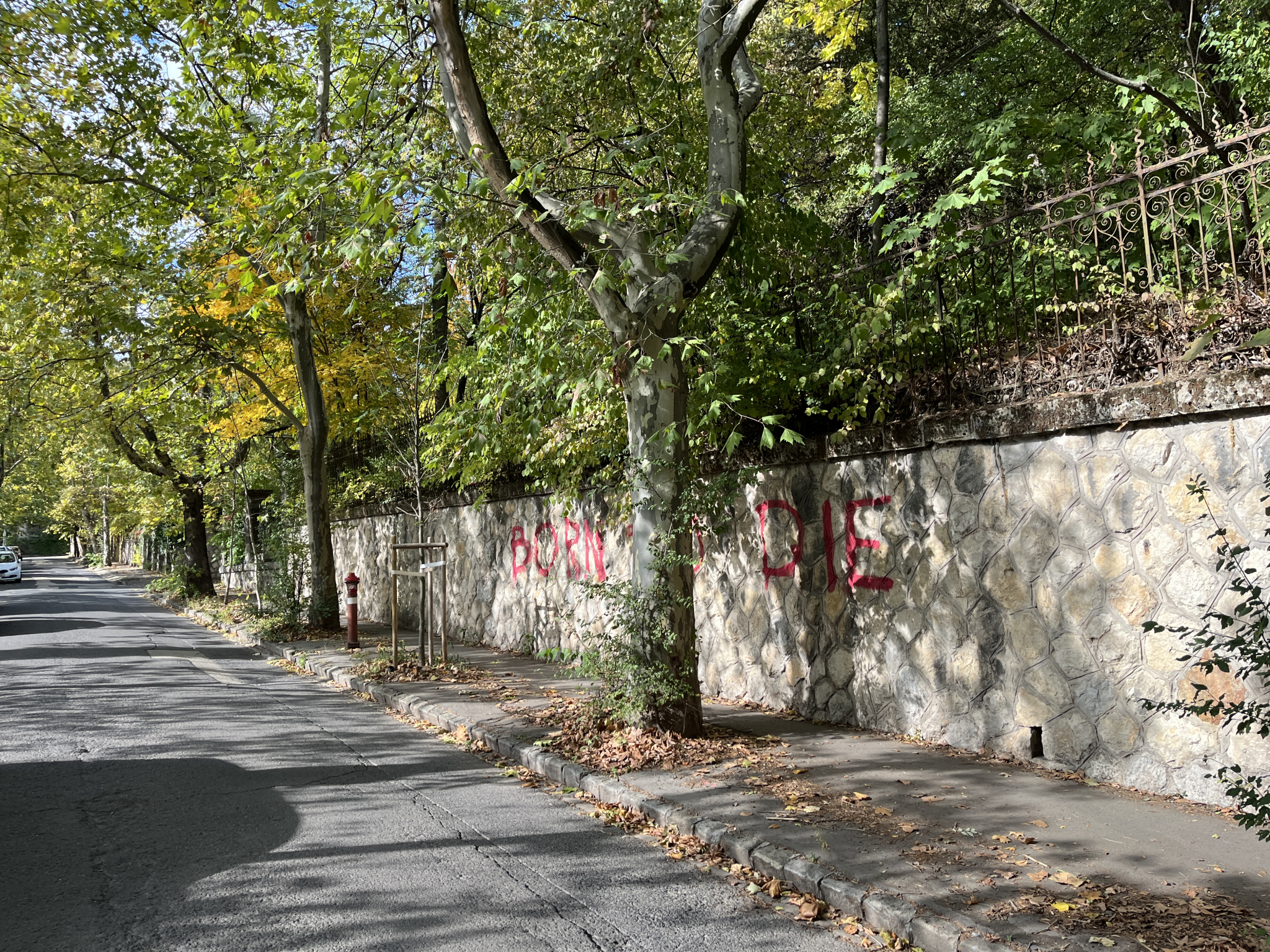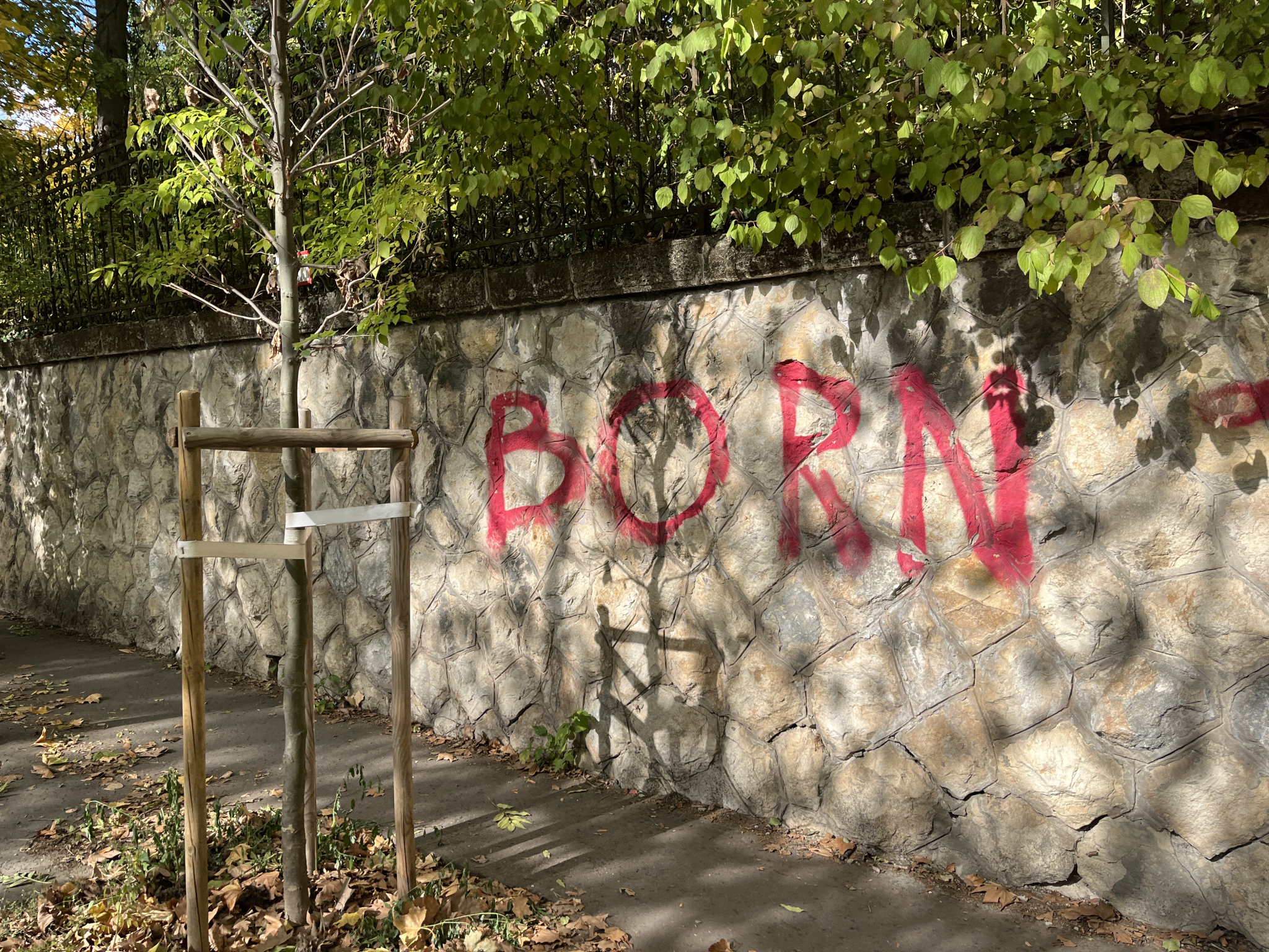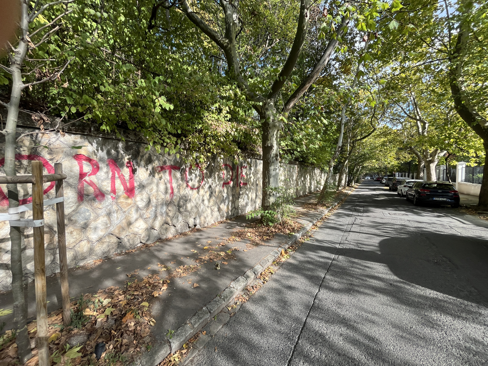 A Bolyai utca - Levél utca sarkánál a kórház irányában óriási rózsaszín graffiti a támfalon.