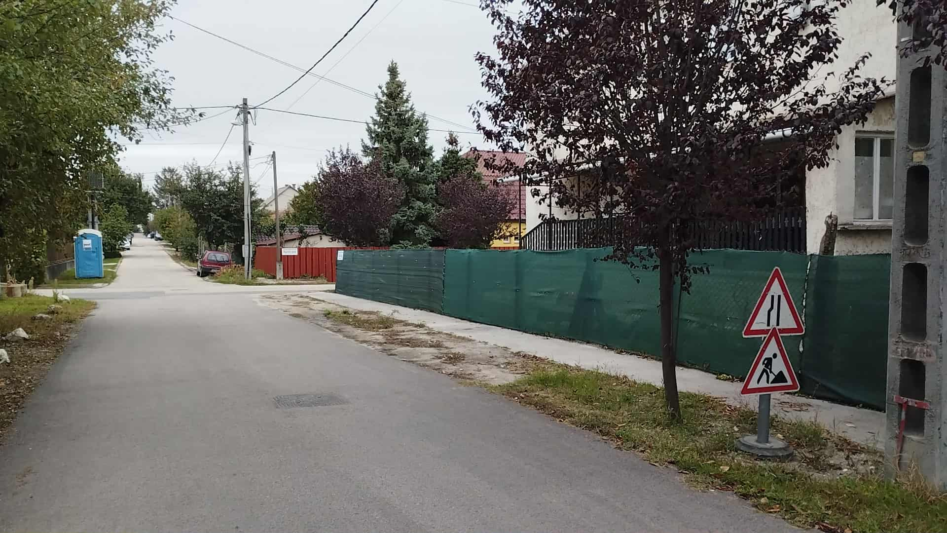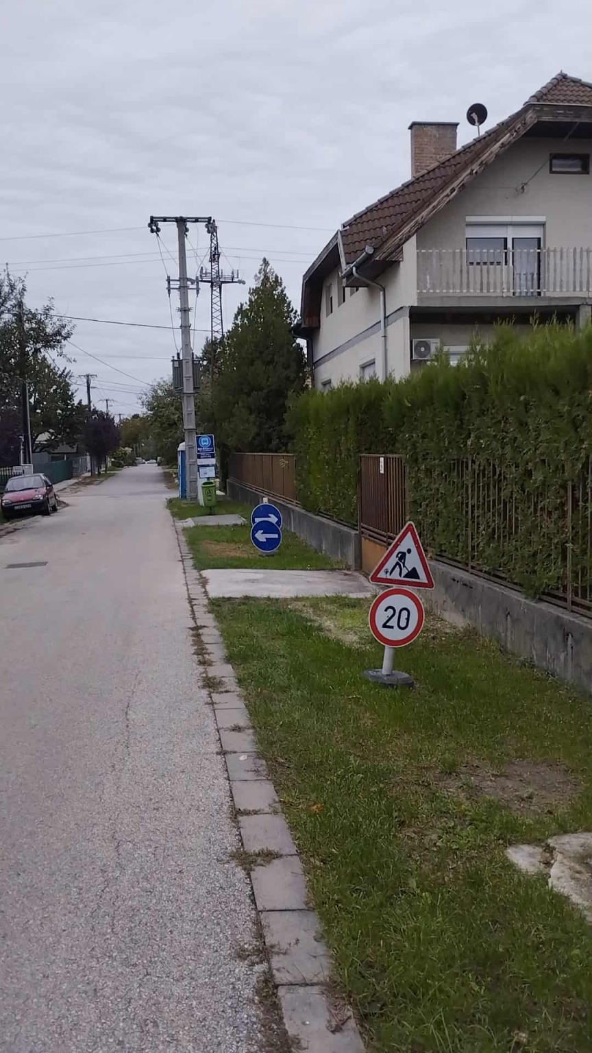 Egy kora nyári útfelújítás során az ideiglenesen kirakott kresz táblák + a munkások toi toi-ja még mindig a helyszínen van.
