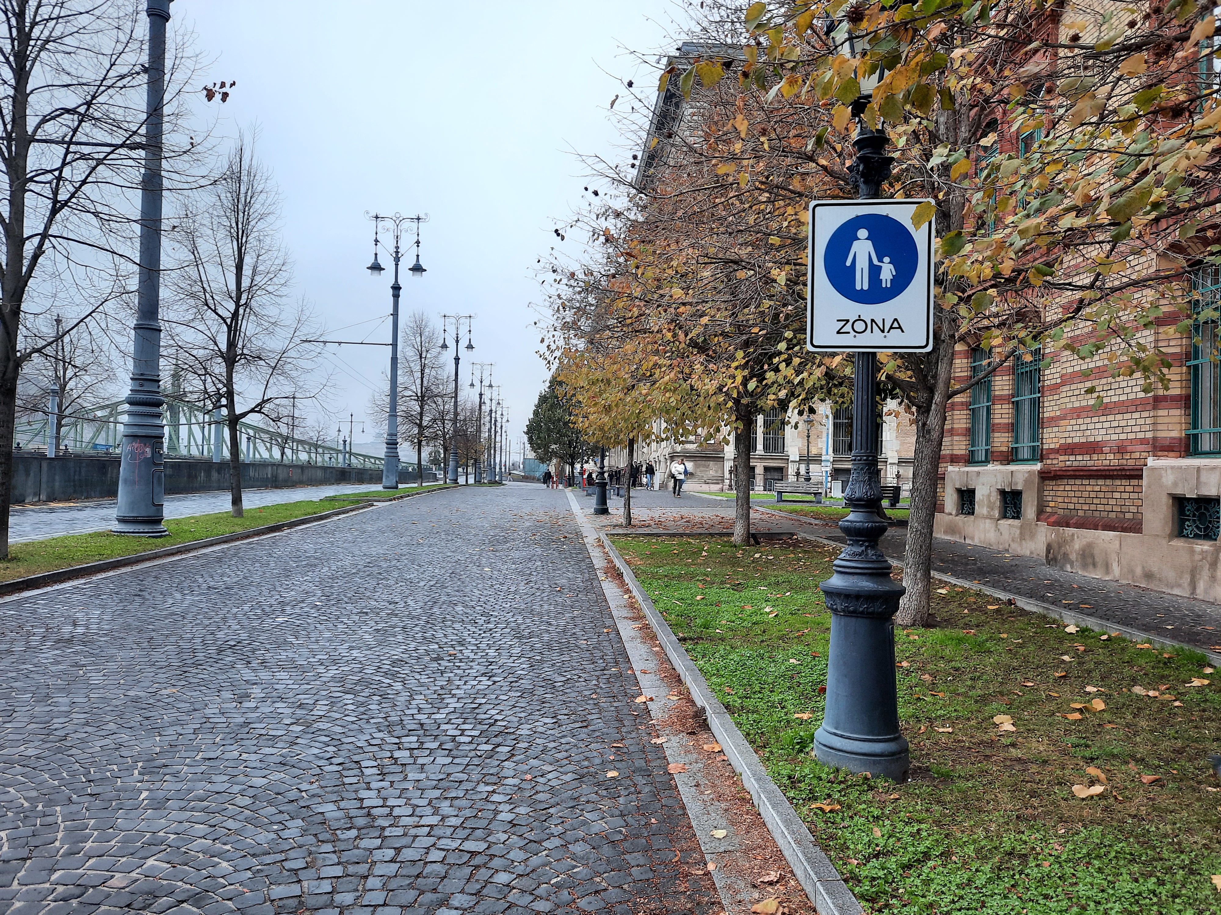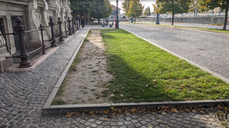 Közgáz melletti járda (a Duna felől oldalon) egy kis darabon leszűkül, mellett füves rész található. A szűk részen az emberek nem férnek el, így a járda "másik fele" ki van taposva a füves részen keresztül - kinek áll ez érdekében? A fű kitaposva, ha esik az eső, az ember cipője sáros lesz.