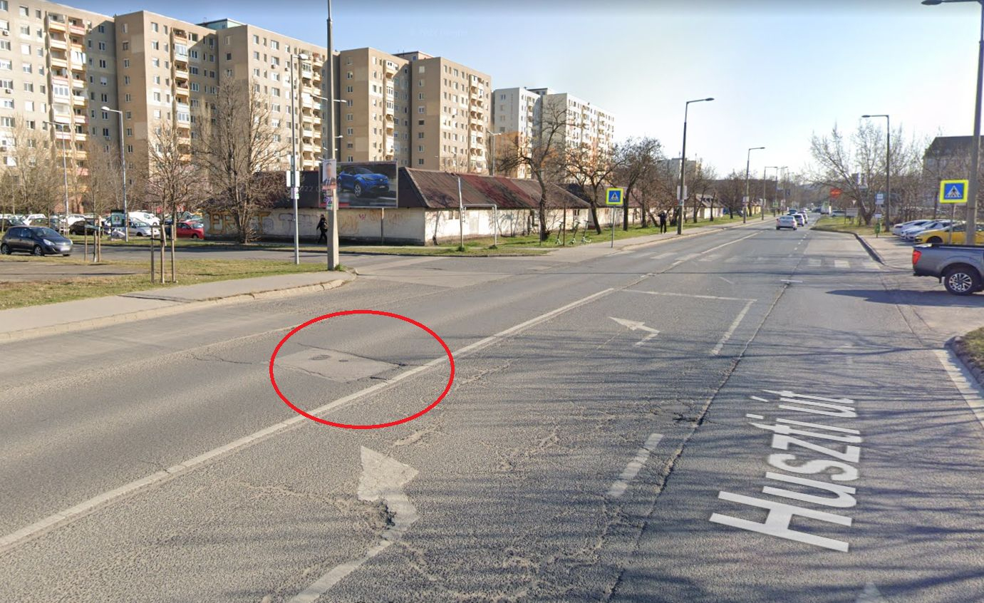 Több centiméter mélyen megsüllyedt egy "vajszínű" útburkolat-javítás egy csatornafedél körül, rongálja az autók futóművét.