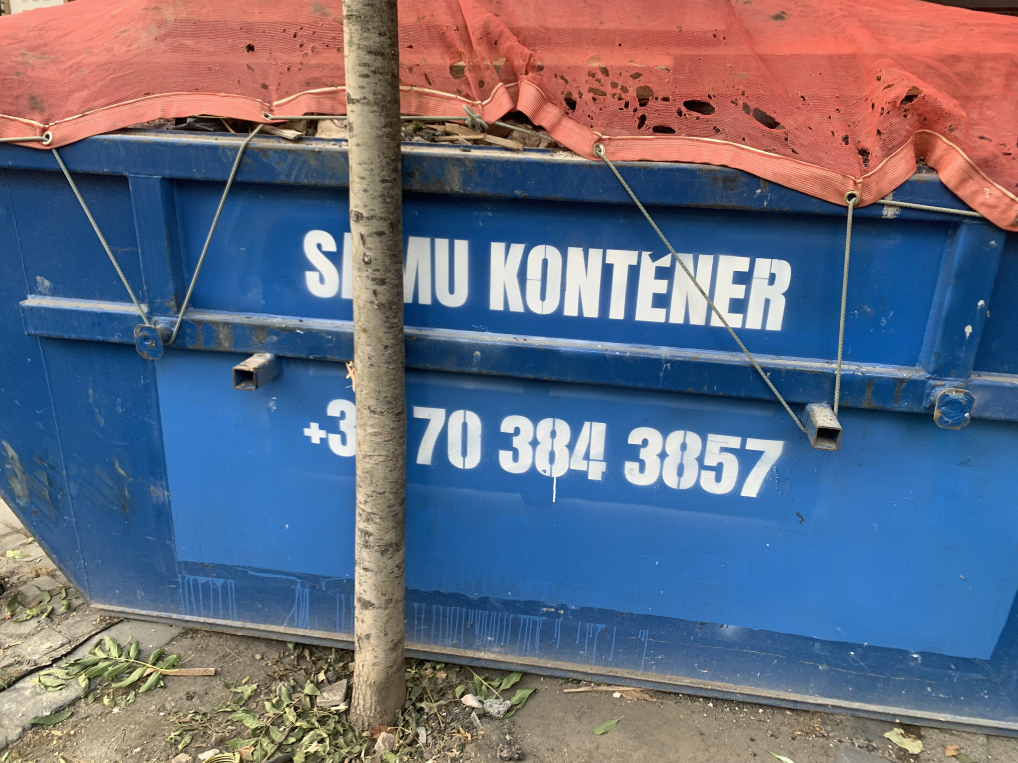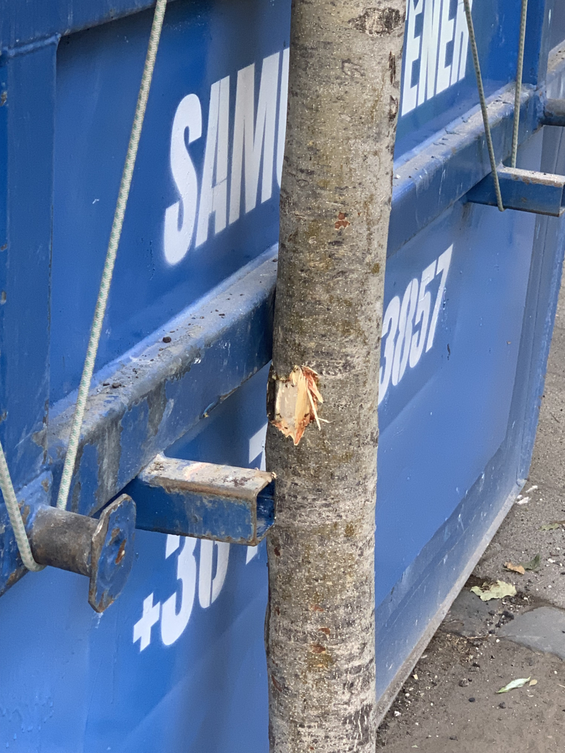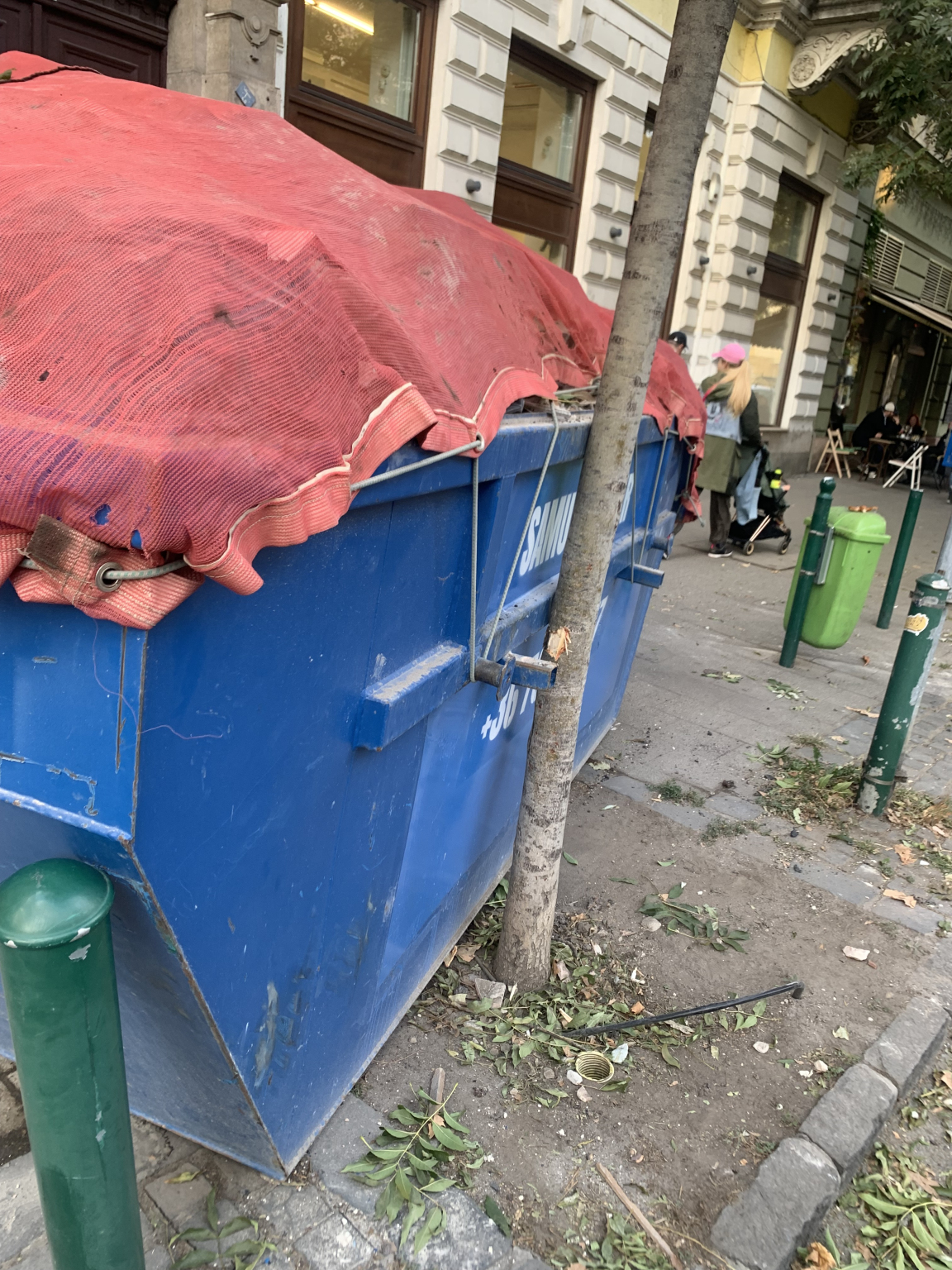 A Gárdonyi térnél, a Bartók Béla út 25 számnál egy konténer úgy lett elhelyezve a járdára, hogy megsértette az ott lévő kőrisfa törzsét.