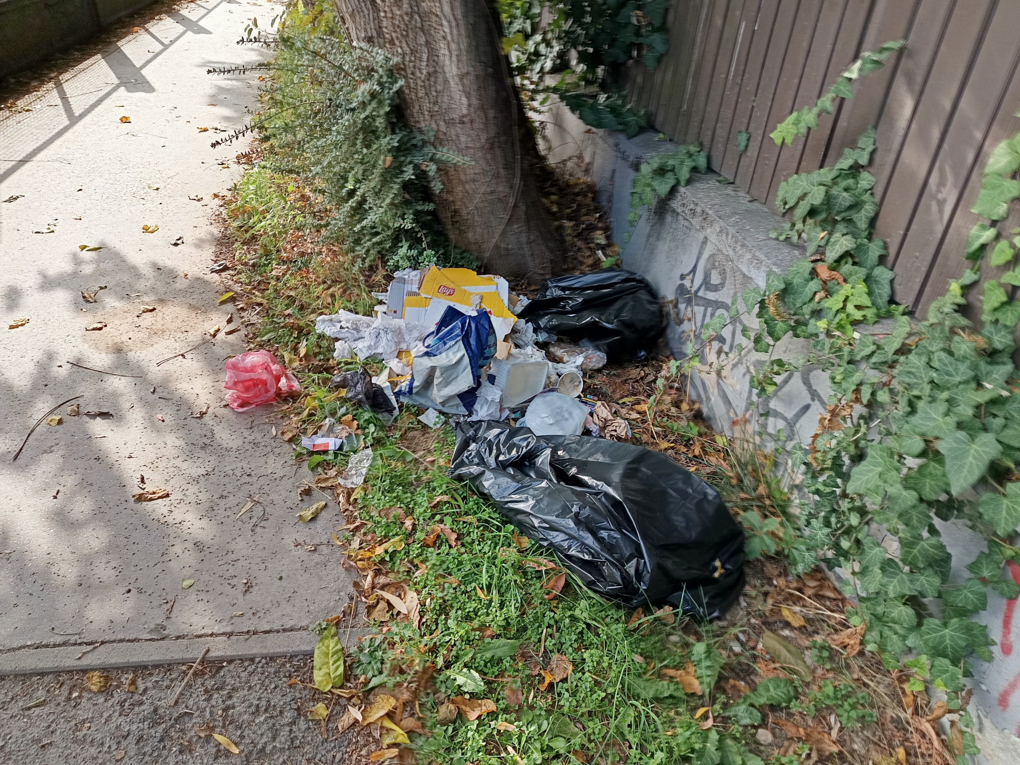 A korábbi (legutóbbi) Aquincumi hév-megálló végében - úgy tűnik - rendszeresen tesznek ki hulladékot, többnyire a hév kerítésén belülre, többnyire inkább komposztálható dolgokat. Nem elég ügyesen válogat a szemetelő, mert patkányt is láttam már itt, és nejlonba csomagolt szemetet is. Most viszont valaki a kommunális szemeteszsákját hozta ide és ejtette el, a járda ellentétes oldalán. Cigarettacsikkek tömkelege (veszélyes hulladék) is van benne.