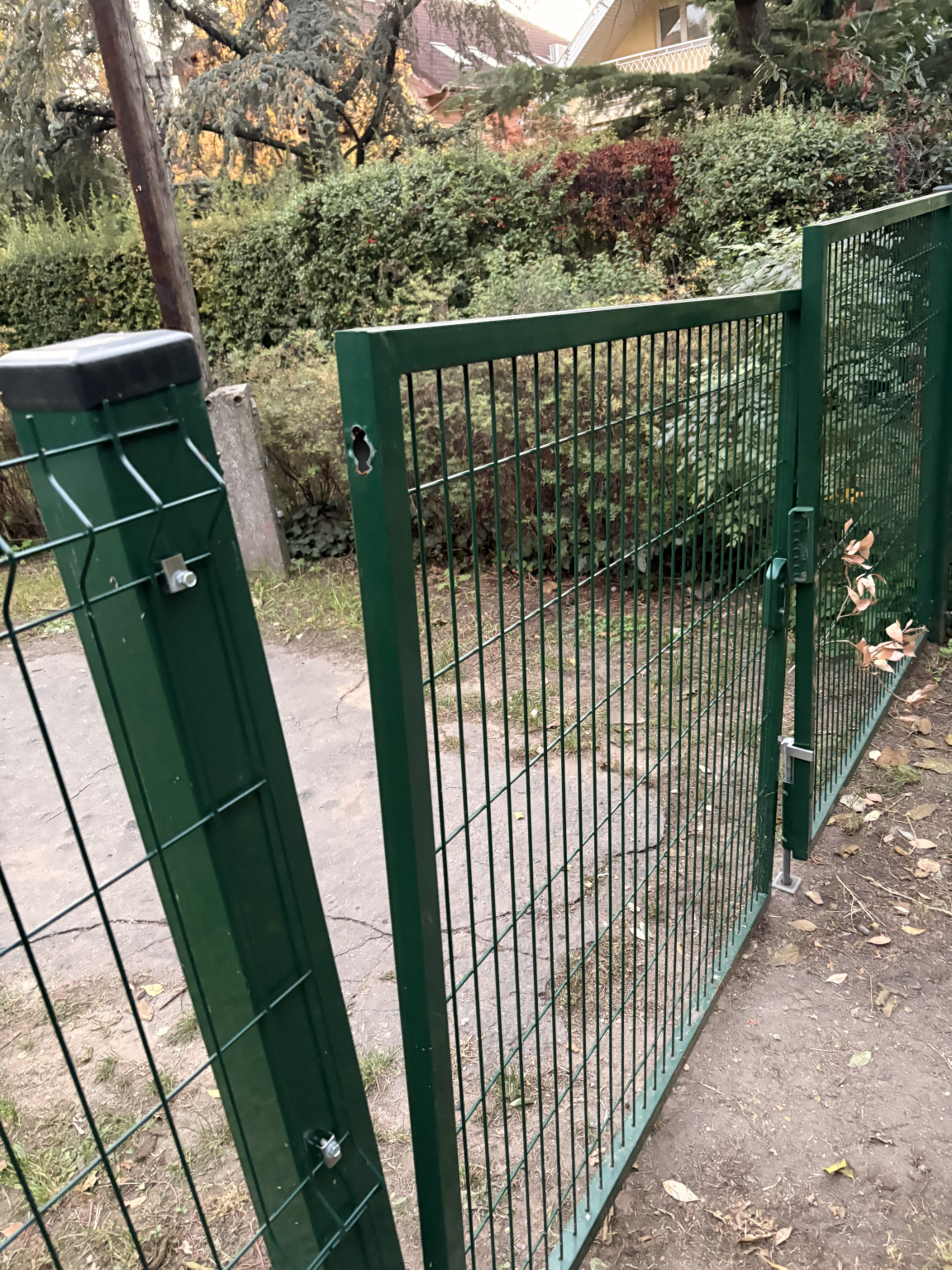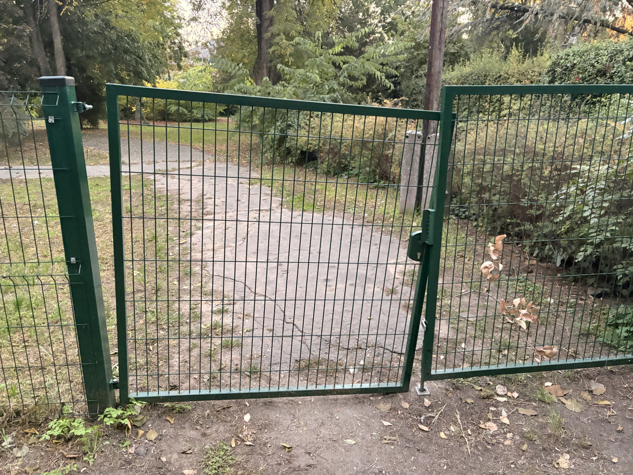 A Martinuzzi kert, Fráter György utca felőli kapuját megrongálták, a felső zsanérról leszakadt.