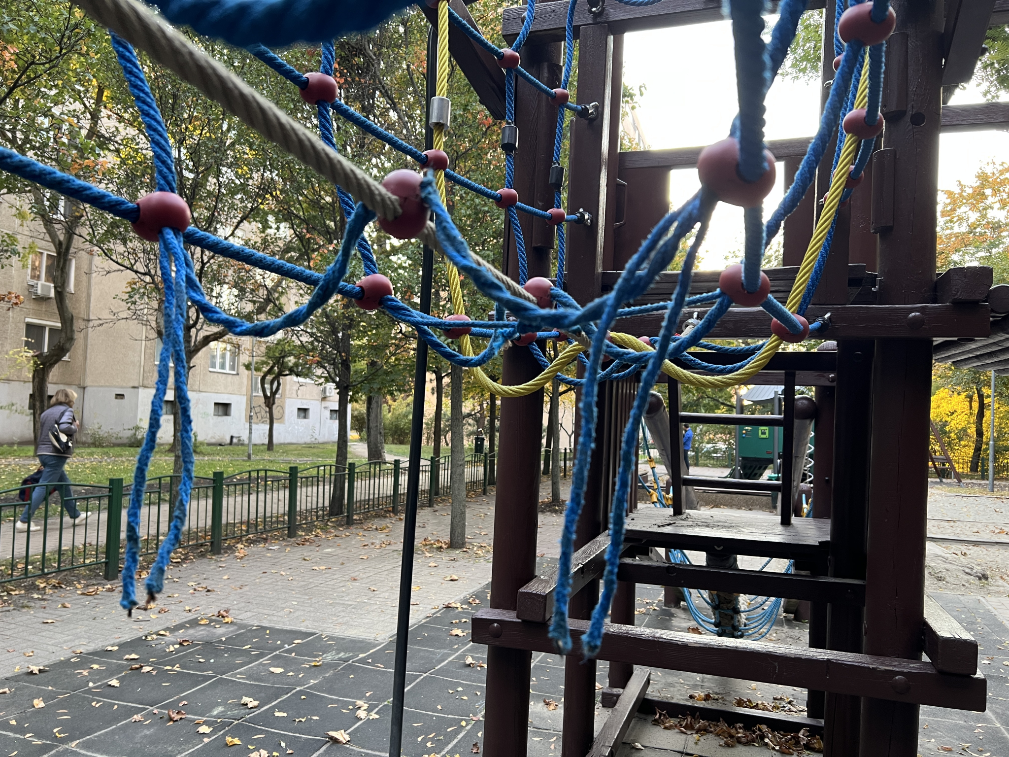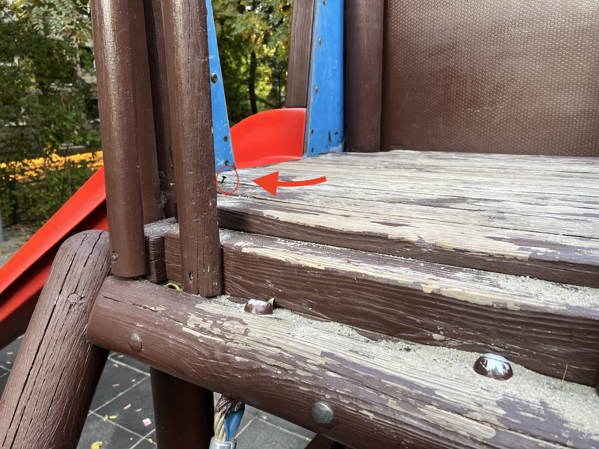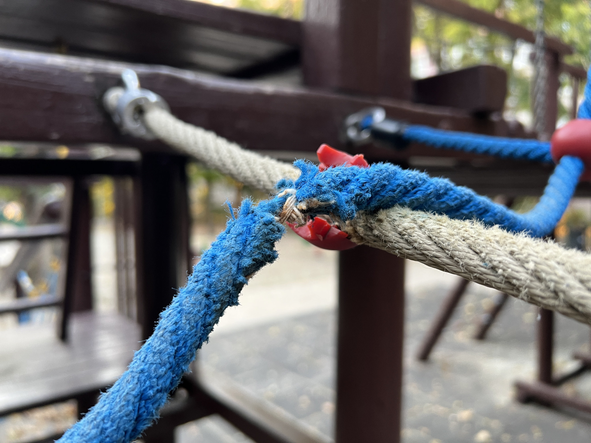 A mászókán több részben elszakadt illetve erősen meggyengült kötél is van. A kötéllétrán van egy kiálló csavar darab. A csúszda mellett szintén van két kiálló csavar. Lásd a mellékelt képeket a pontos problémákért.