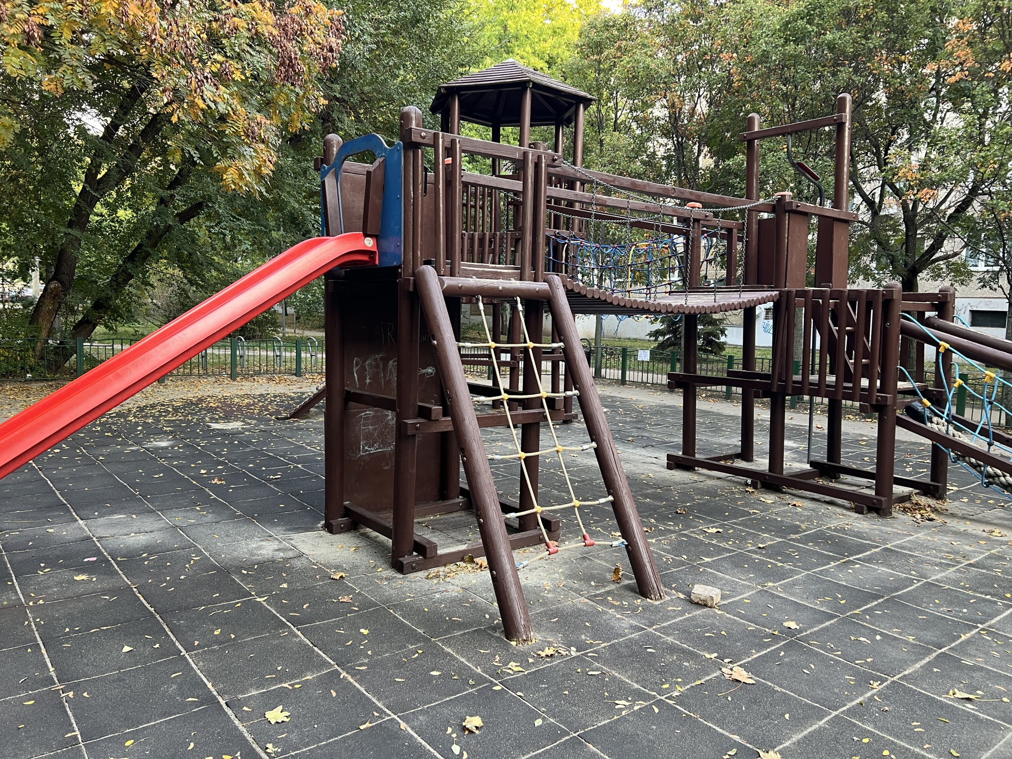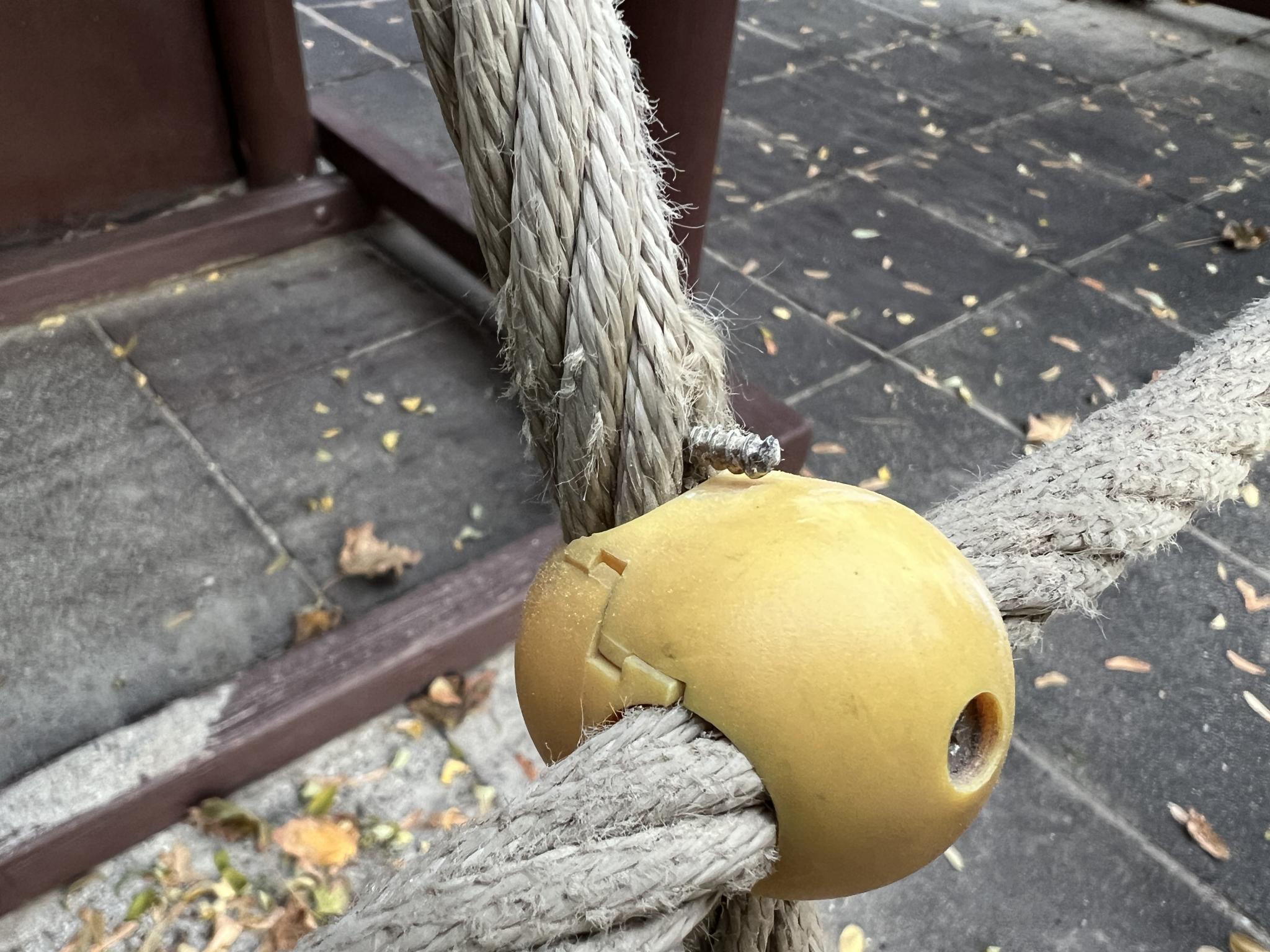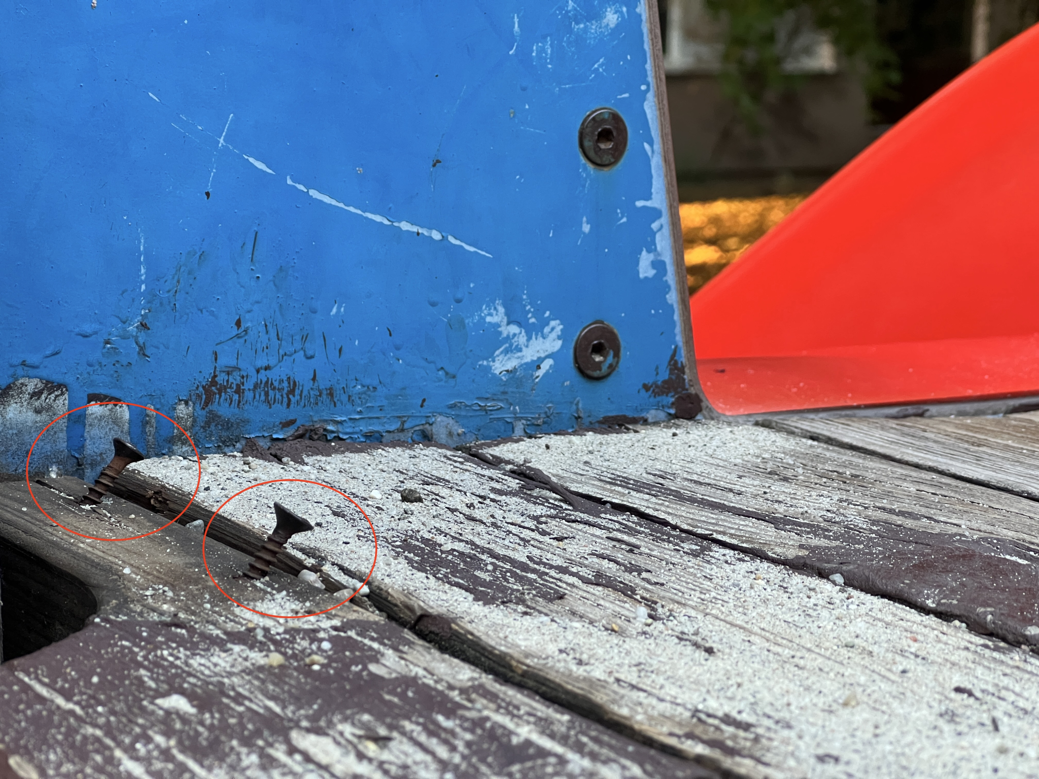 A mászókán több részben elszakadt illetve erősen meggyengült kötél is van. A kötéllétrán van egy kiálló csavar darab. A csúszda mellett szintén van két kiálló csavar. Lásd a mellékelt képeket a pontos problémákért.
