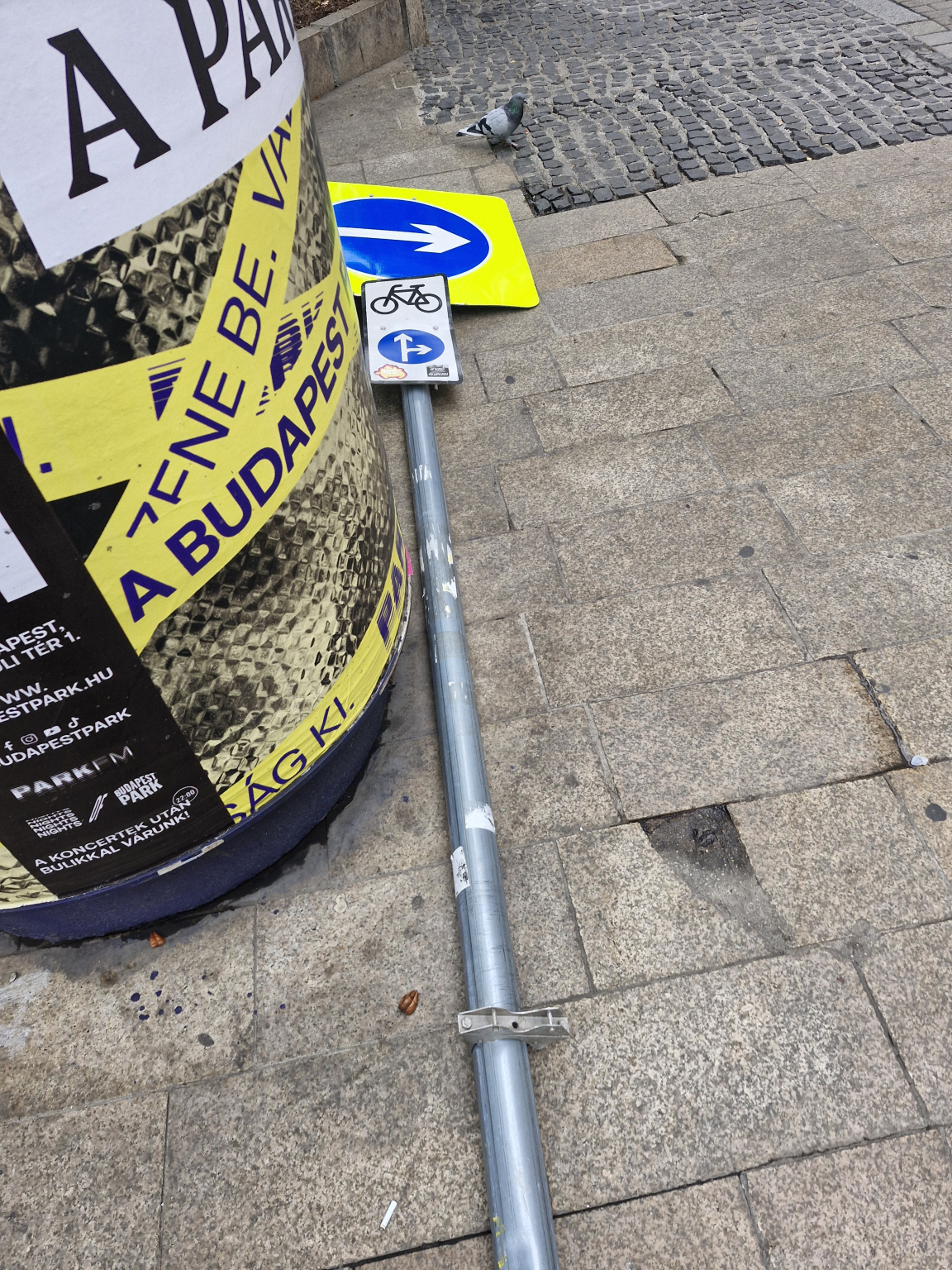 Egy furgon kidöntötte a kötelező haladási irány táblát a Király utca - Rumbach Sebestyén utca sarkon. Ez a tábla tájékoztatta a garázsból kihajtókat a haladási irányról.