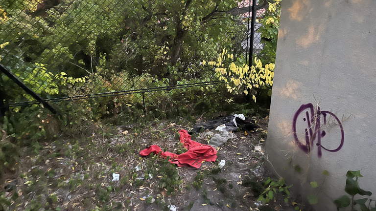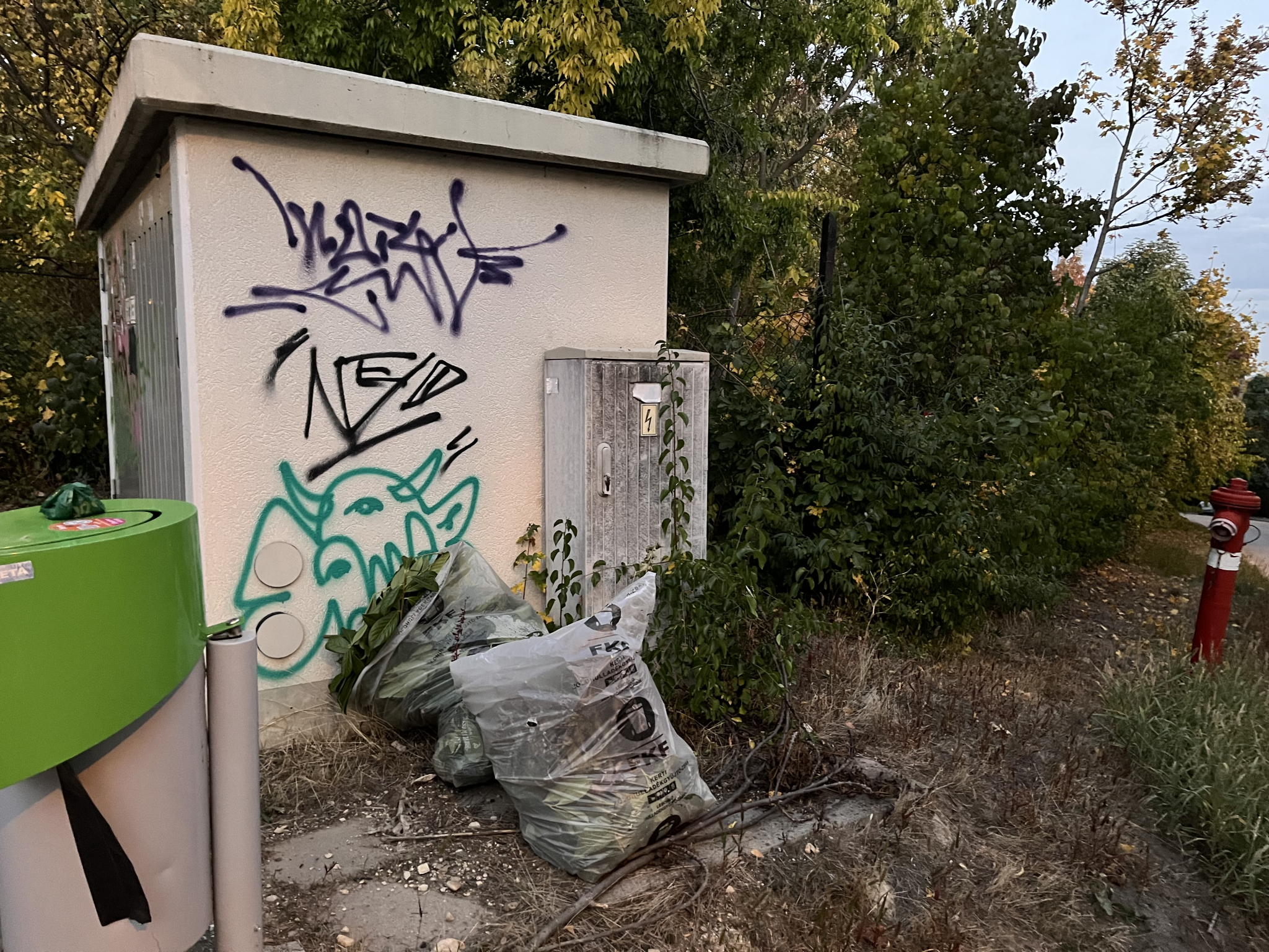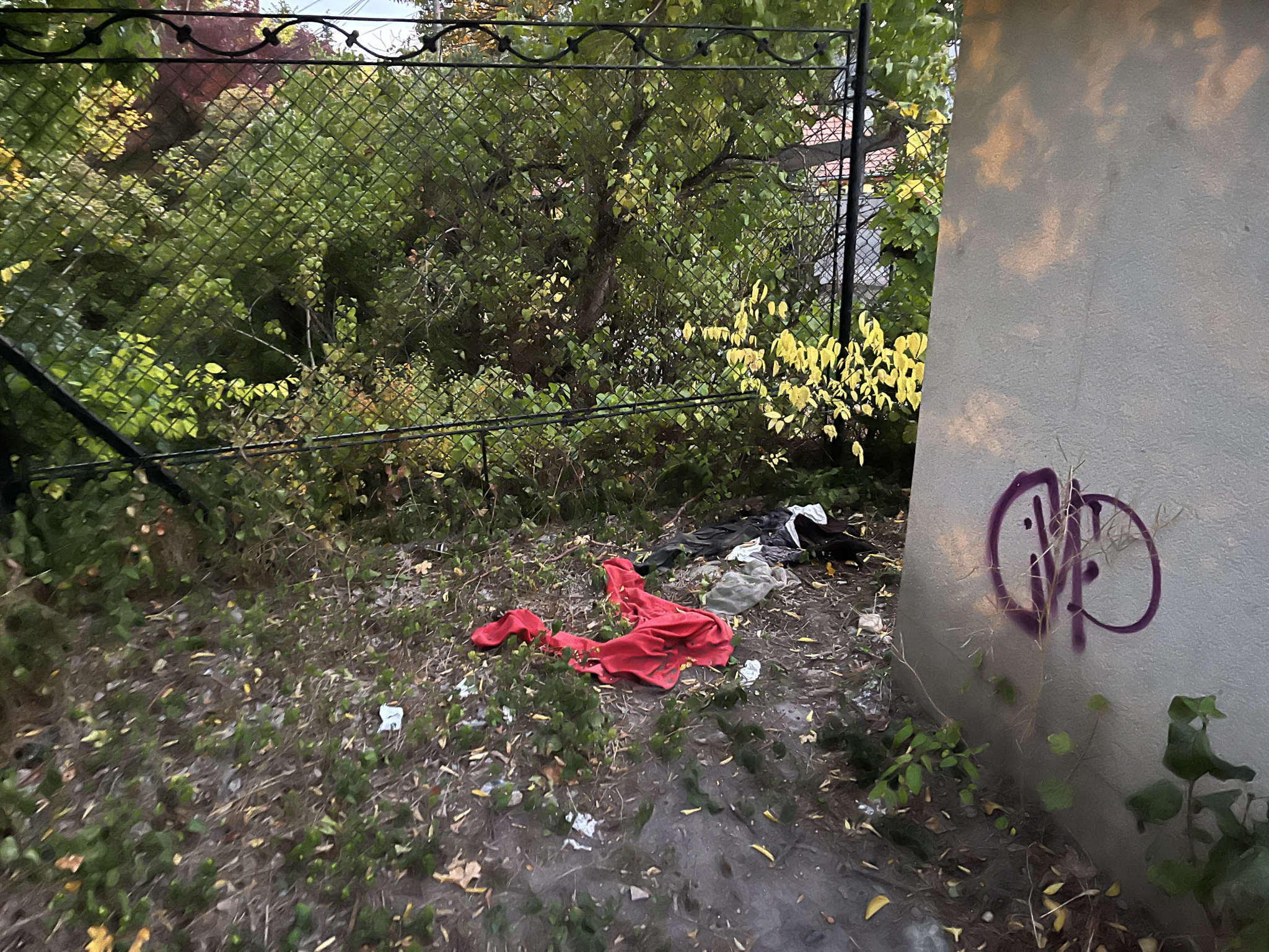 A trafóház környékén eldobált ruhadarabok vannak, valamint hetek óta nem elszállított zöld hulladék.
