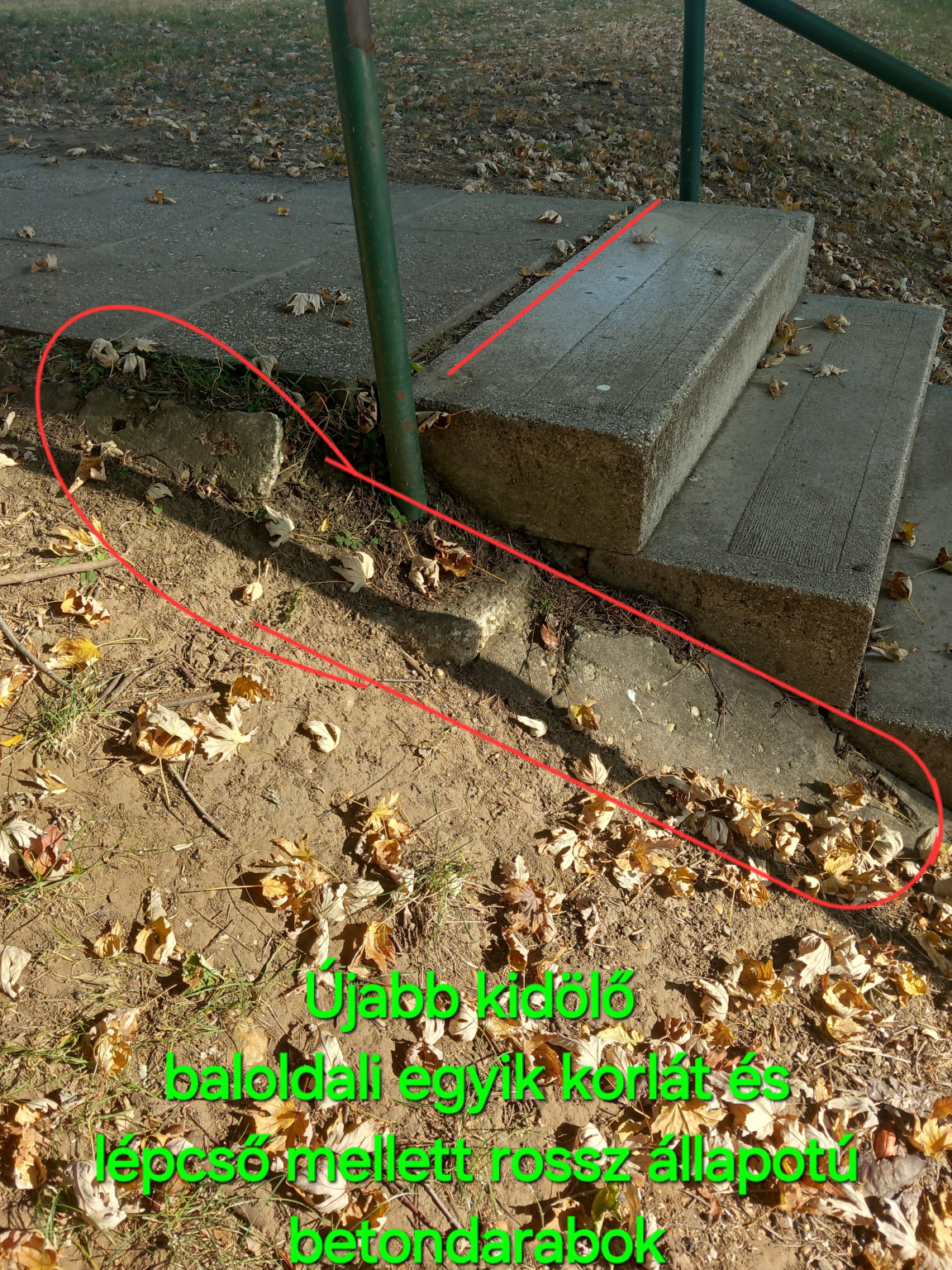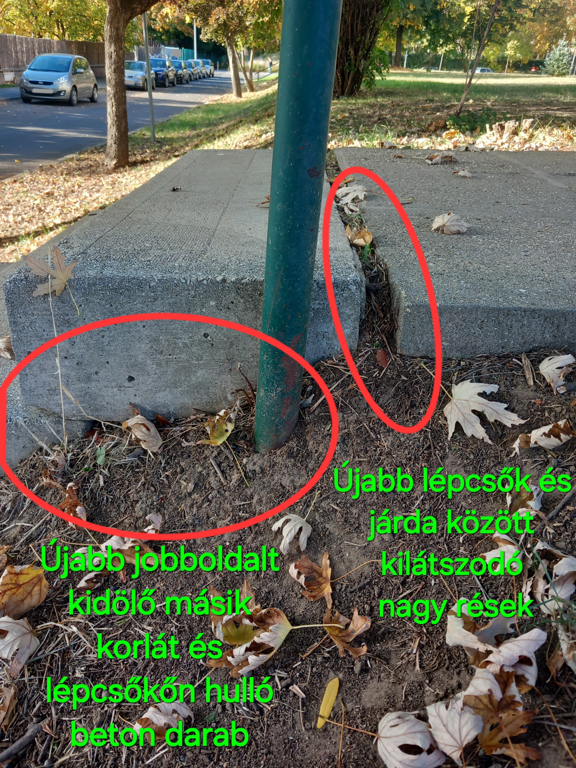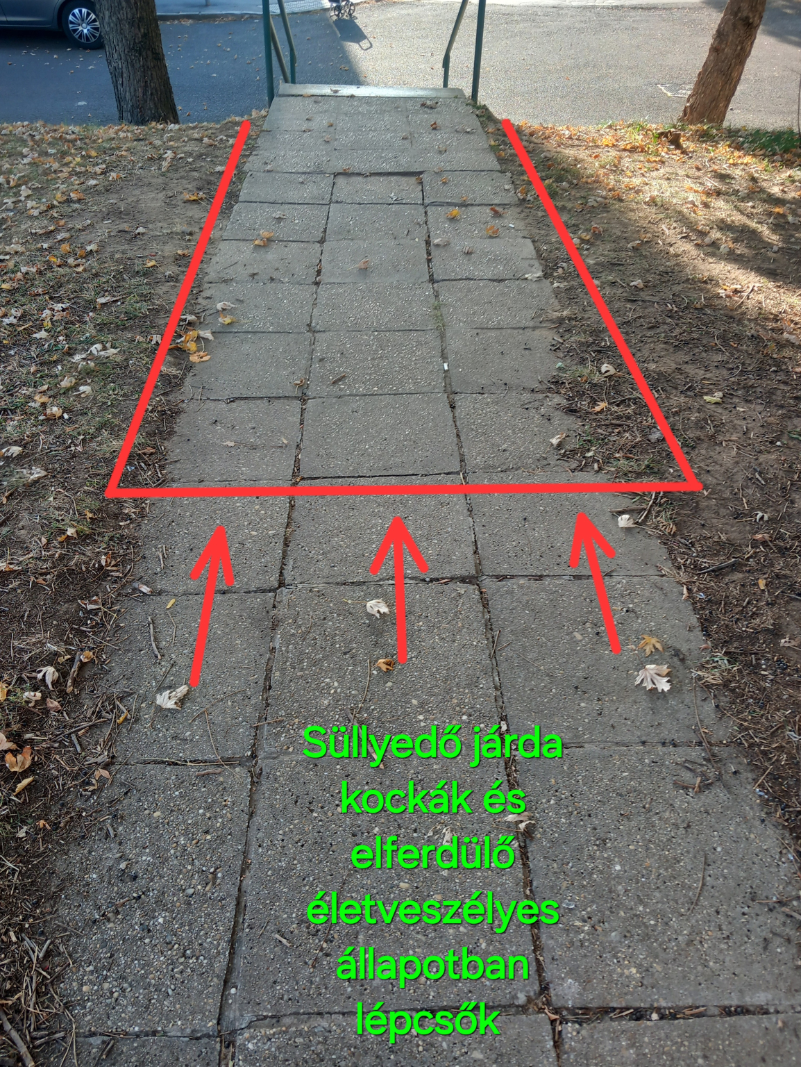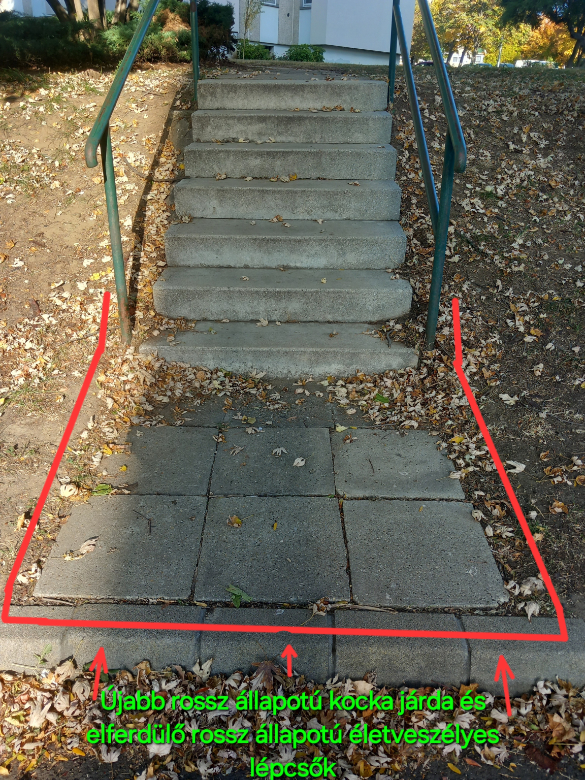 Értesítem hogy a Tavas utca 4 es szám alatt felé közvetlenül Sütőde utca útvonalon között, középső Lépcsők olyan életveszélyes lépcsők és korlátok illetve járda kockák hogy süllyedés van lassan használhatatlan, pirossal jelölve a járda kockák és lépcsők között nagyobb rések és mennyiség vannak, illetve életveszélyes lépcsők mellett hullanak betonok helyükről, valamint mind két korlátok bármikor kidölhetnek és lépcsők és járda kockák tartathatlan állapotban van, rá férne felújítás