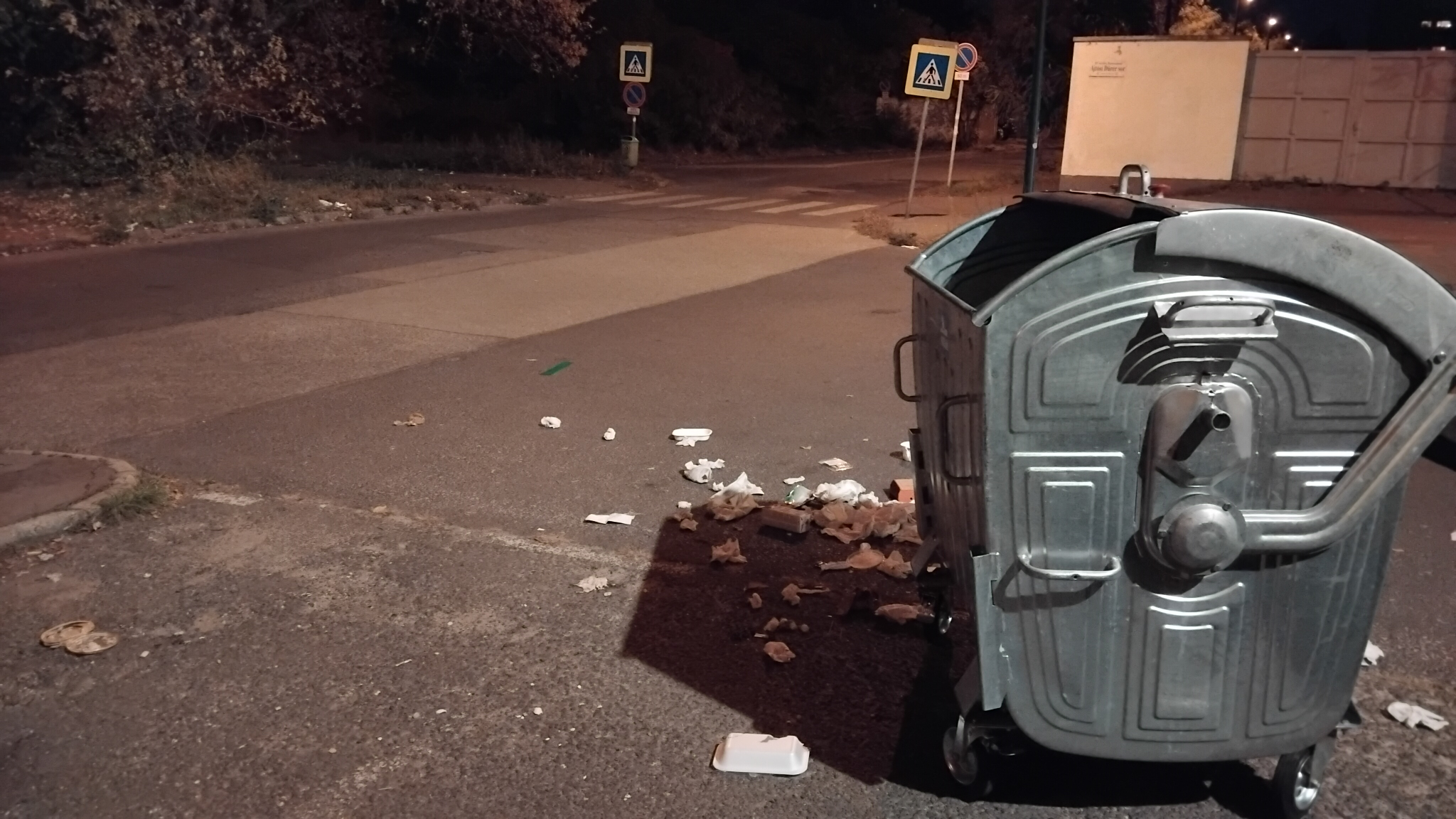 Kérjük a probléma gyökerét (legyen lezárva a konténer, nyitás legyen megoldható az ürítés időpontjakor) és következményeit (szétfújt szemét összeszedése) is orvosolni szíveskedjenek.