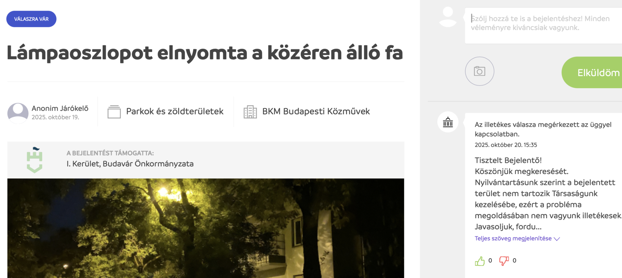 „Nyilvántartásunk szerint a bejelentett terület nem tartozik Társaságunk kezelésébe, ezért a probléma megoldásában nem vagyunk illetékesek. Javasoljuk, forduljon a kerületi önkormányzathoz.”