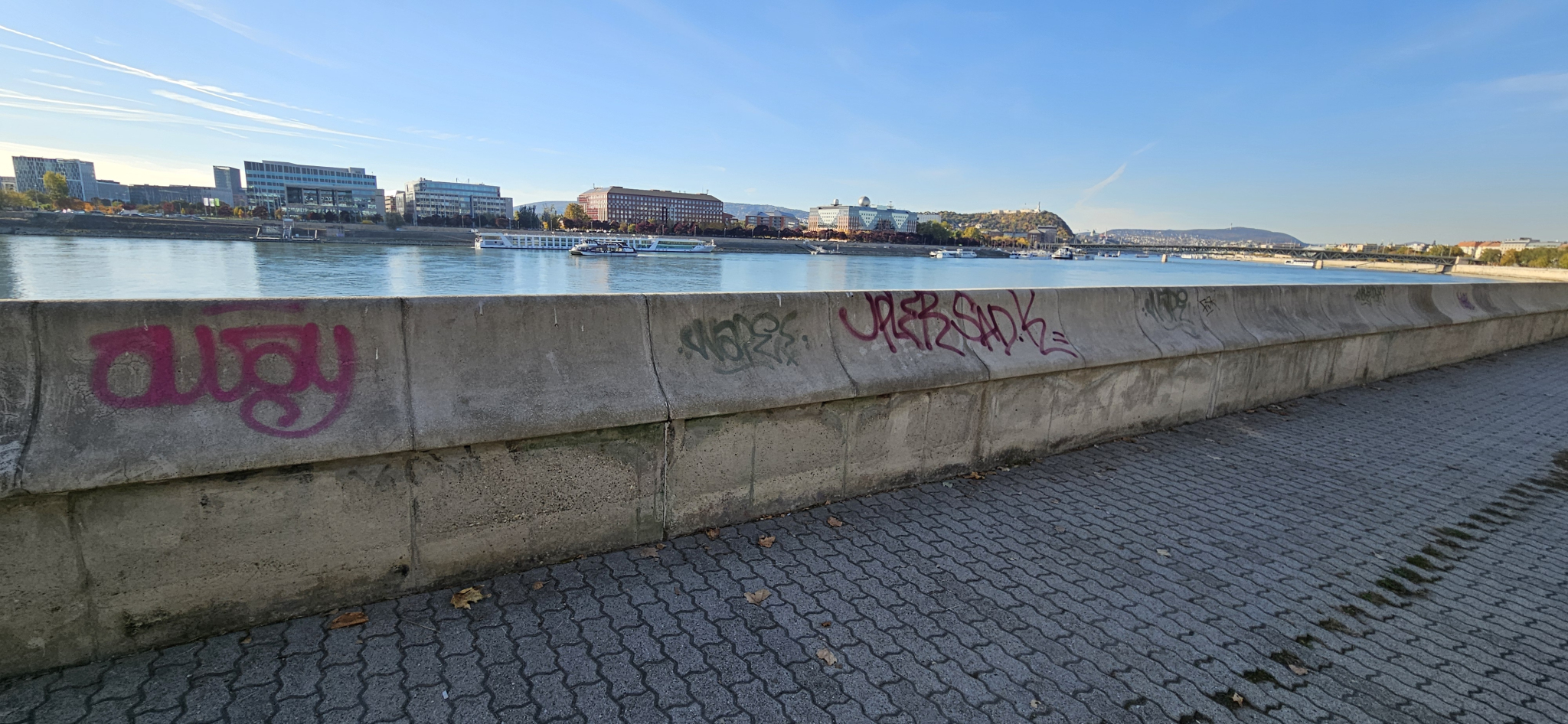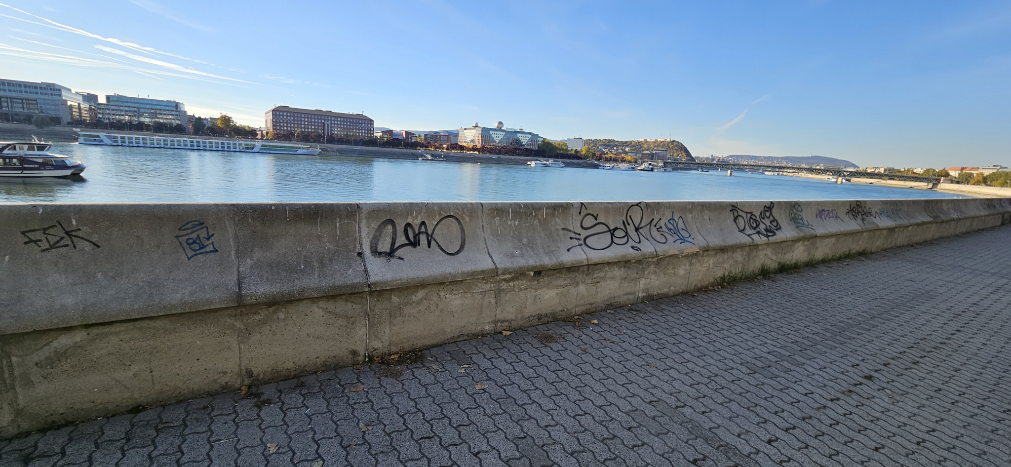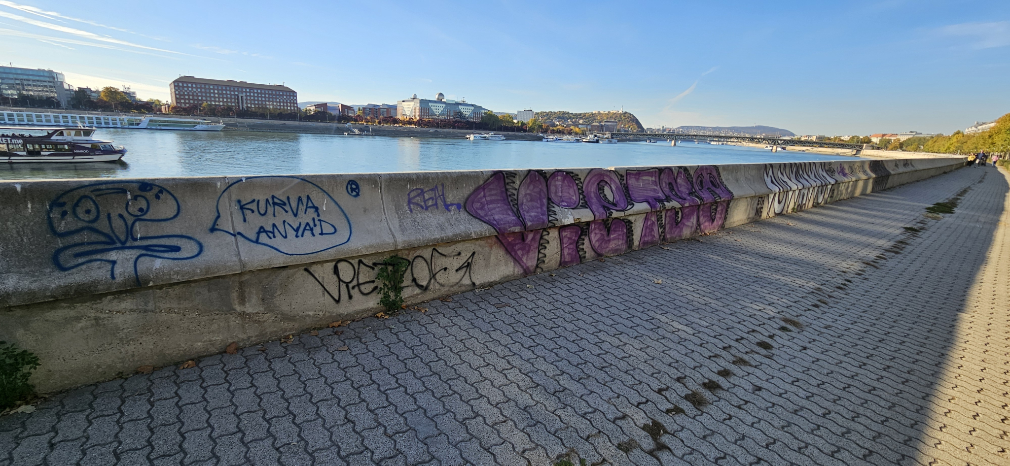A pesti Duna-part a Rákóczi és a Petőfi híd között az utóbbi időben tisztább lett, de még mindig sok graffiti található a rakparton (a középső részben).
