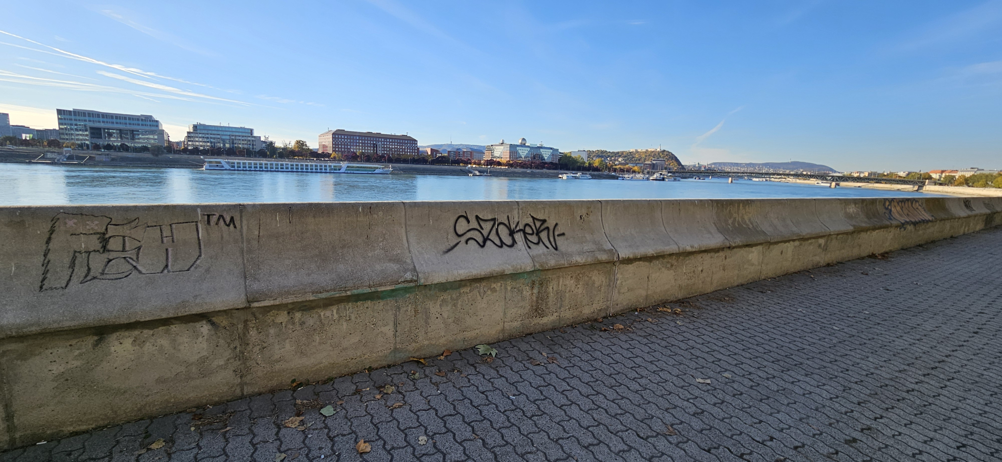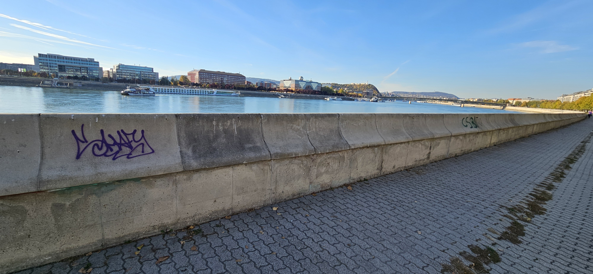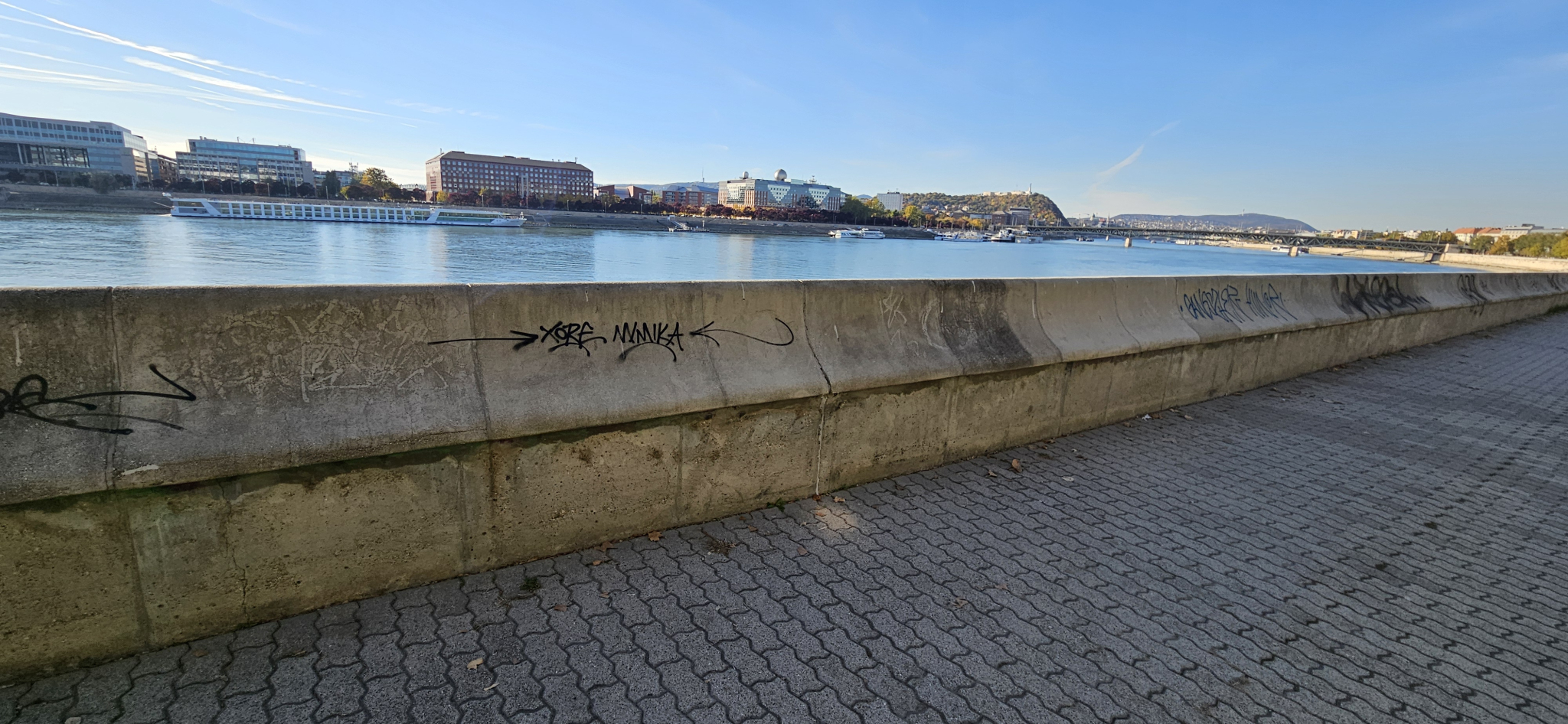 A pesti Duna-part a Rákóczi és a Petőfi híd között az utóbbi időben tisztább lett, de még mindig sok graffiti található a rakparton (a középső részben).