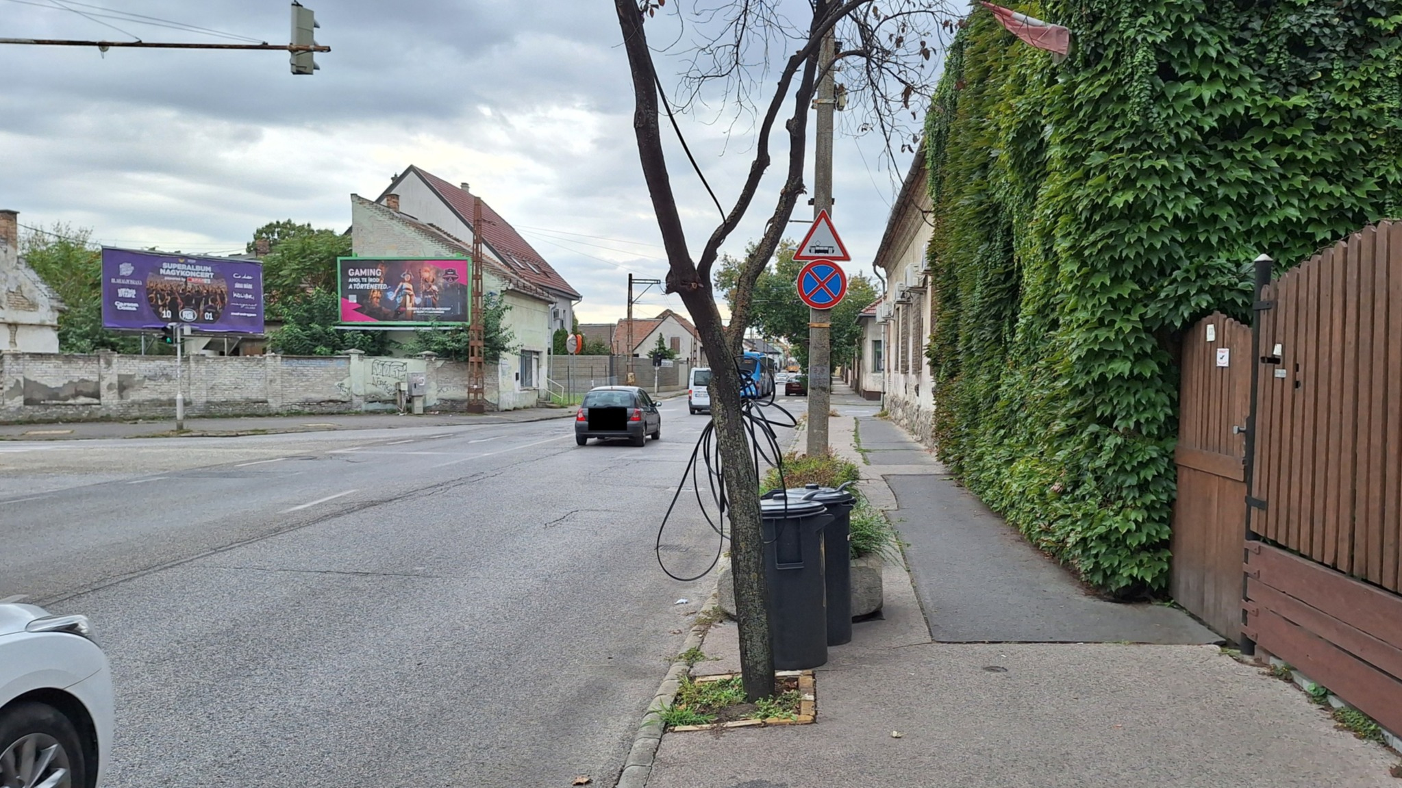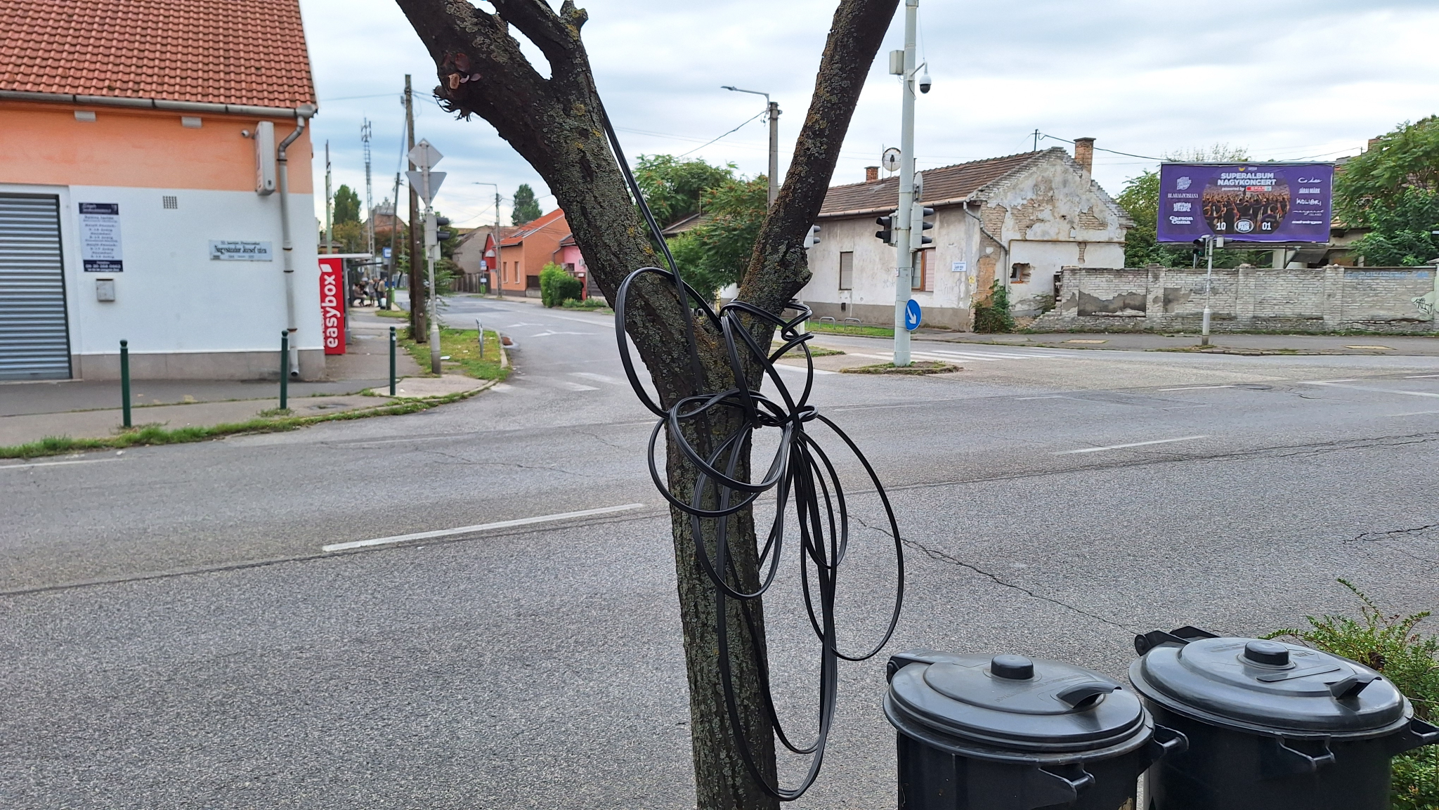A Nagysándor József utca 131. előtt lelóg egy vezeték és fel van tekeredve egy fára.