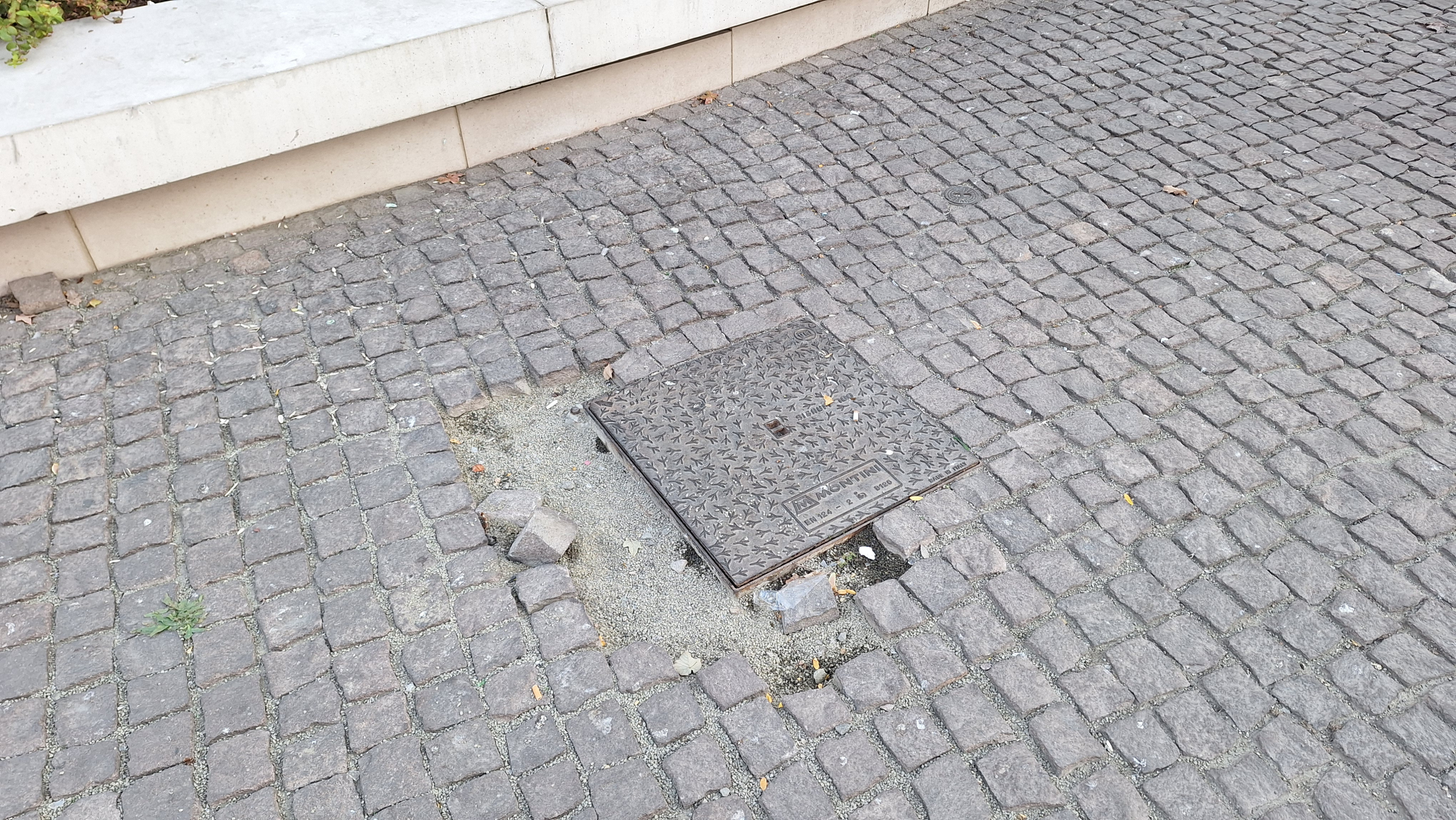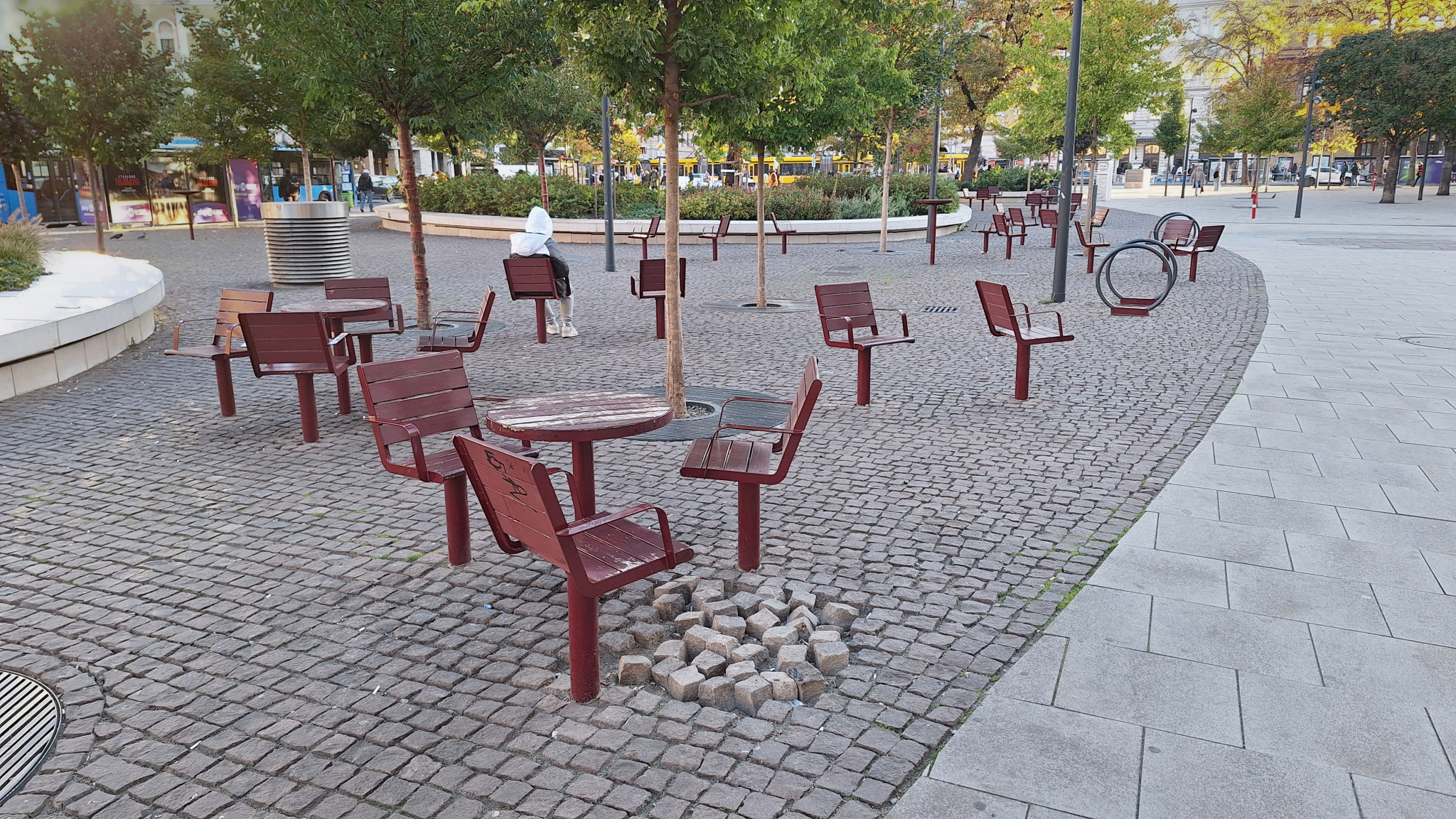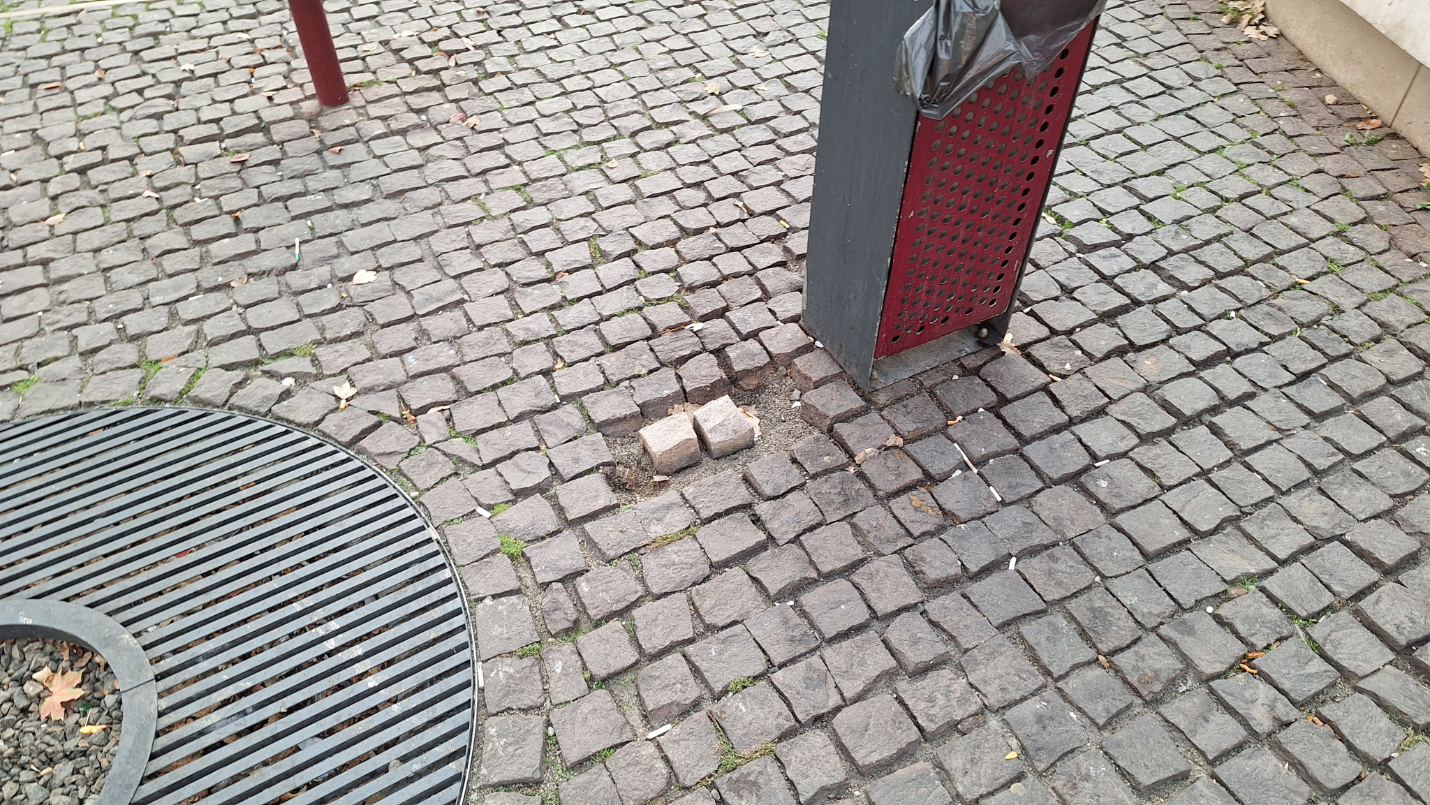 A Blaha Lujza téren a 7-es busz megállójától nem messze az egyik szemetes mellett máris hiányos a kockakőburkolat.