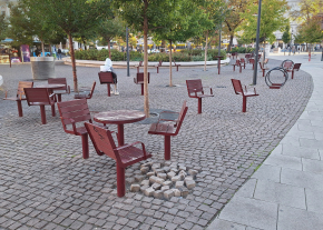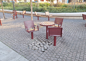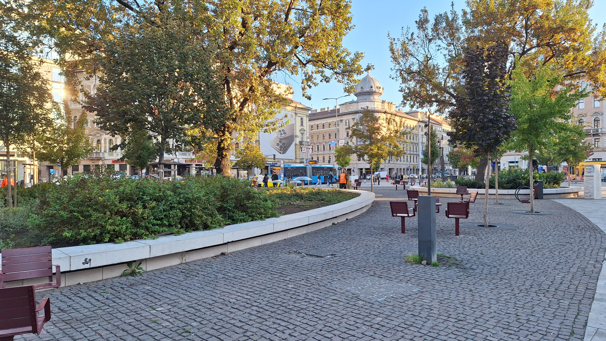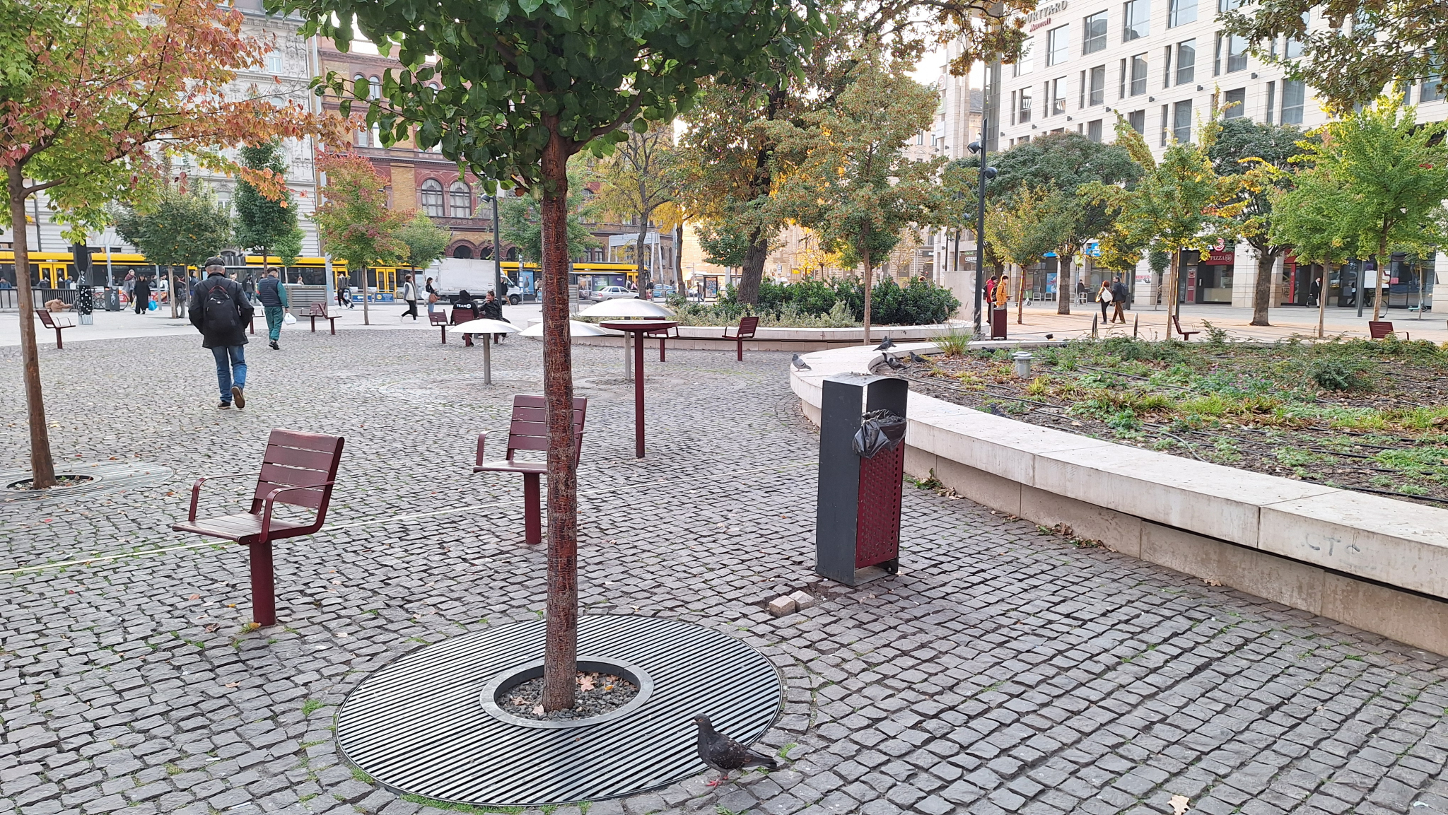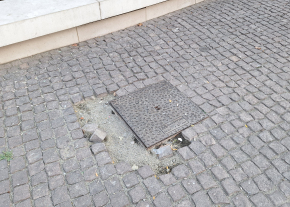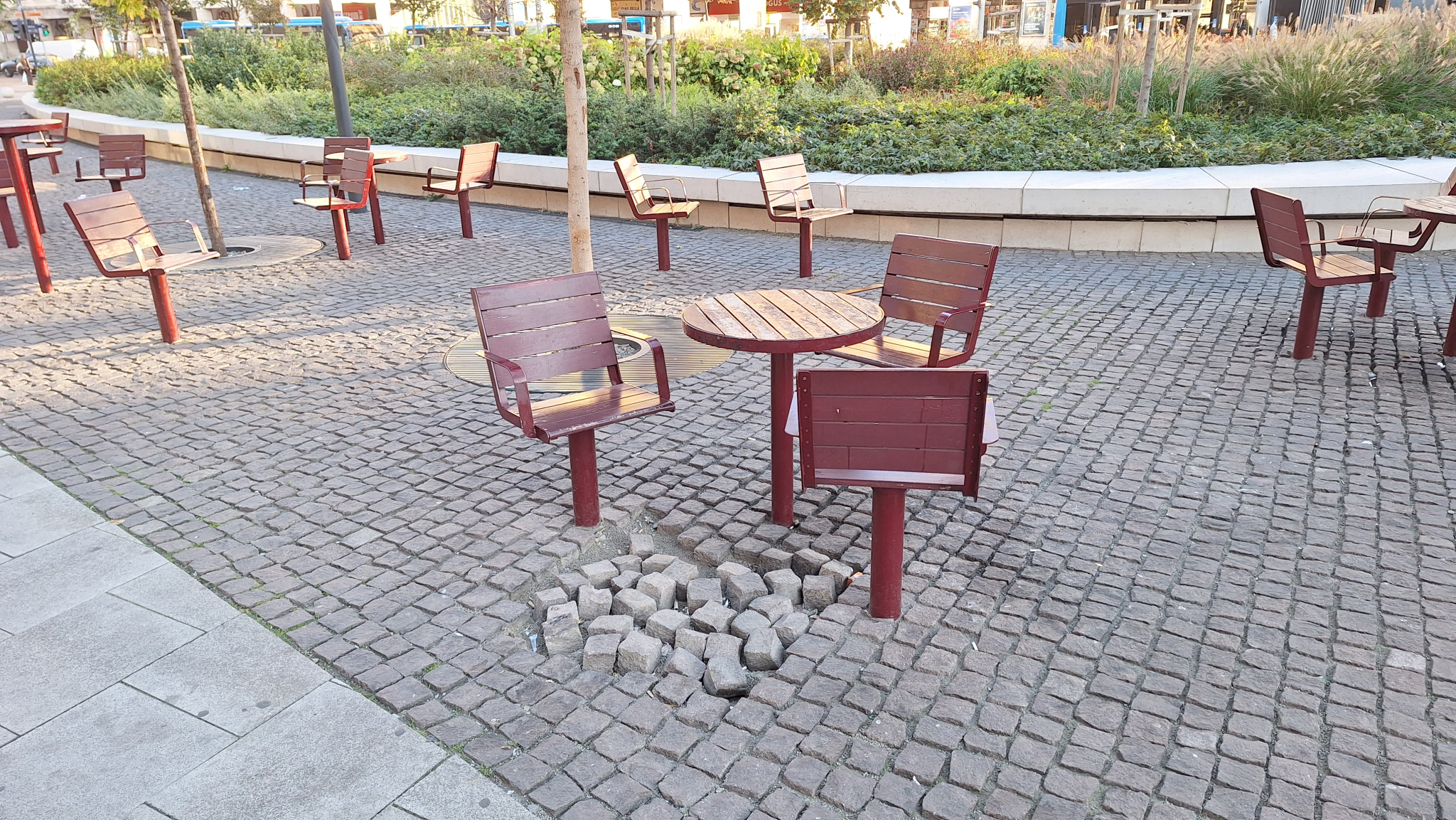 A Blaha Lujza téren a 7-es busz megállójától nem messze az egyik szemetes mellett máris hiányos a kockakőburkolat.