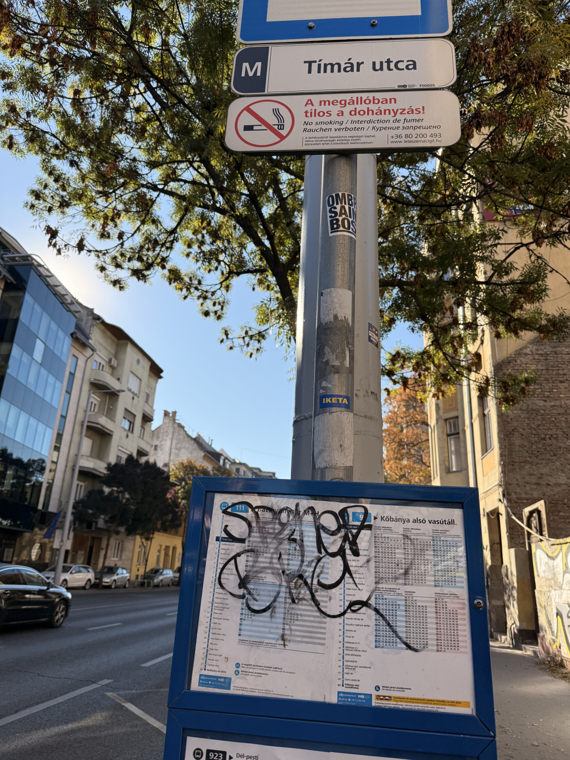 A 9-es busz tímár utcai menetrendtáblájra össze van firkálva, így az nehezen olvasható.
