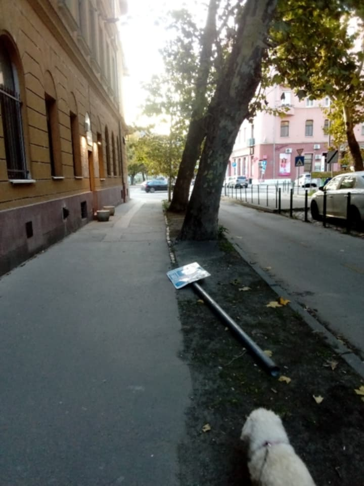 Két hete a Nagyszombat utca 6 számtól a Lajos utca felé kb húsz méterre kidőlt tábla hever