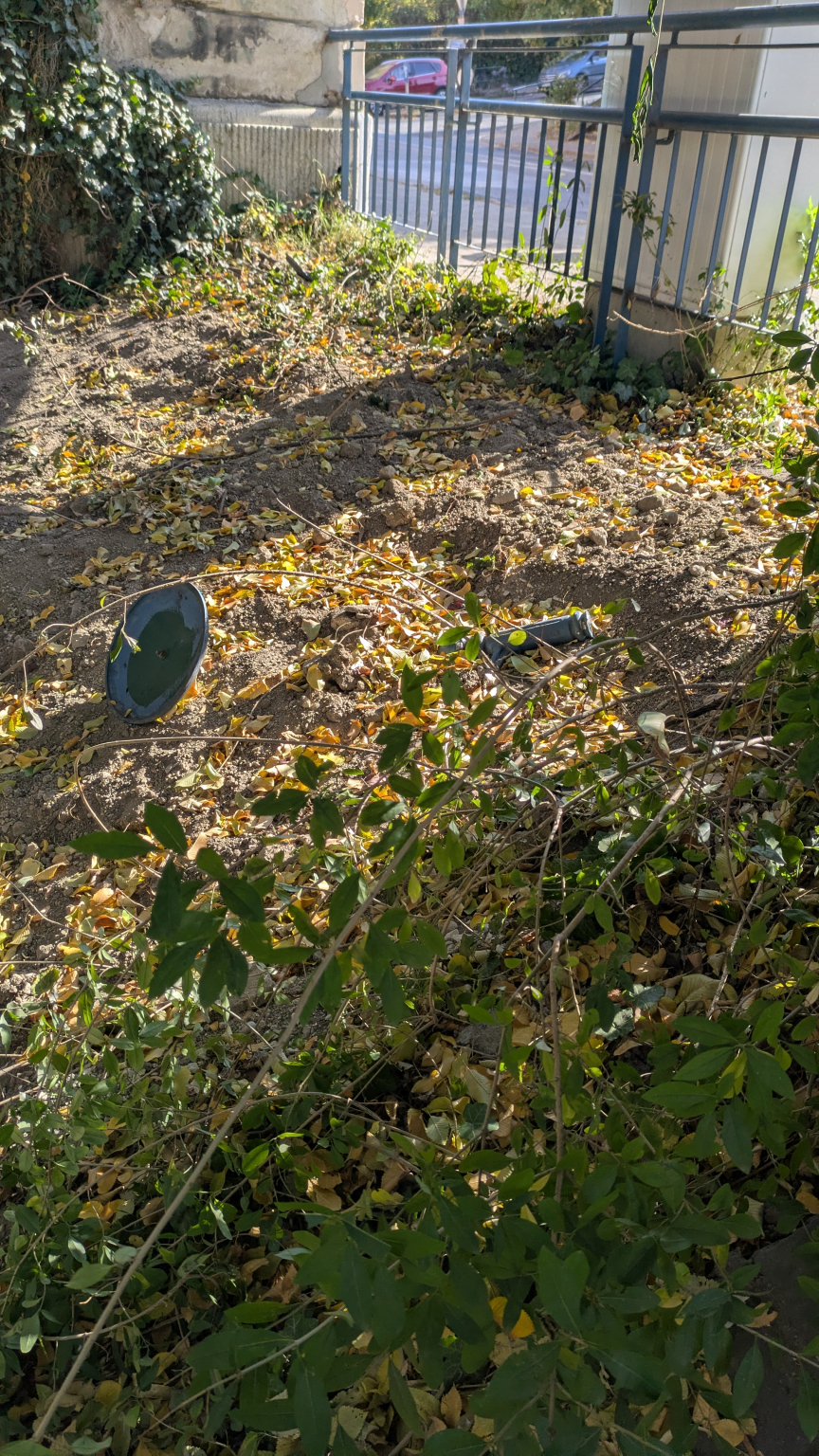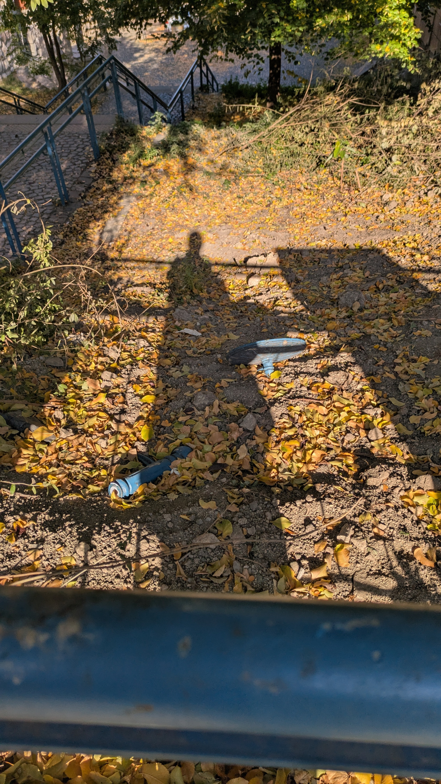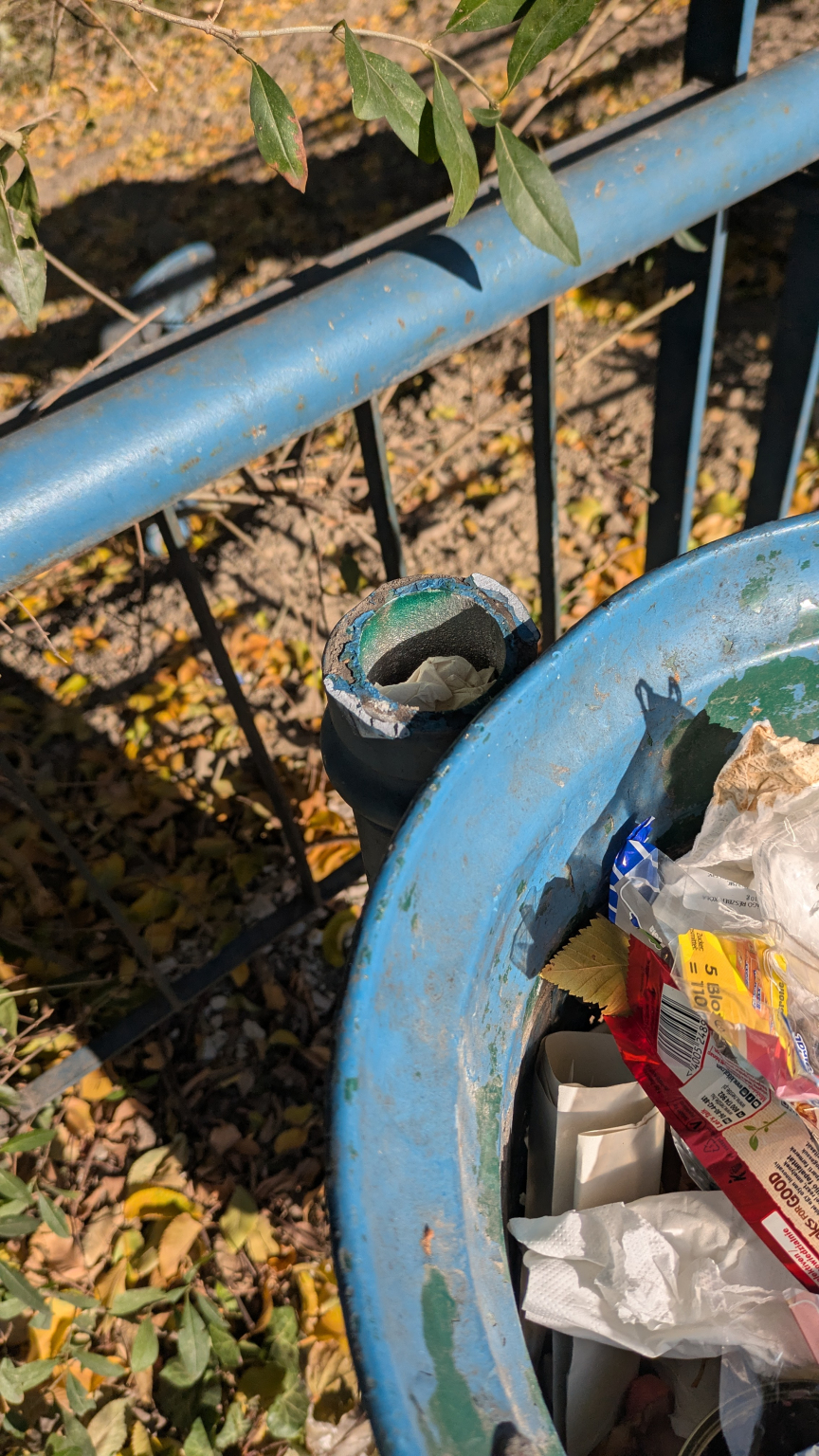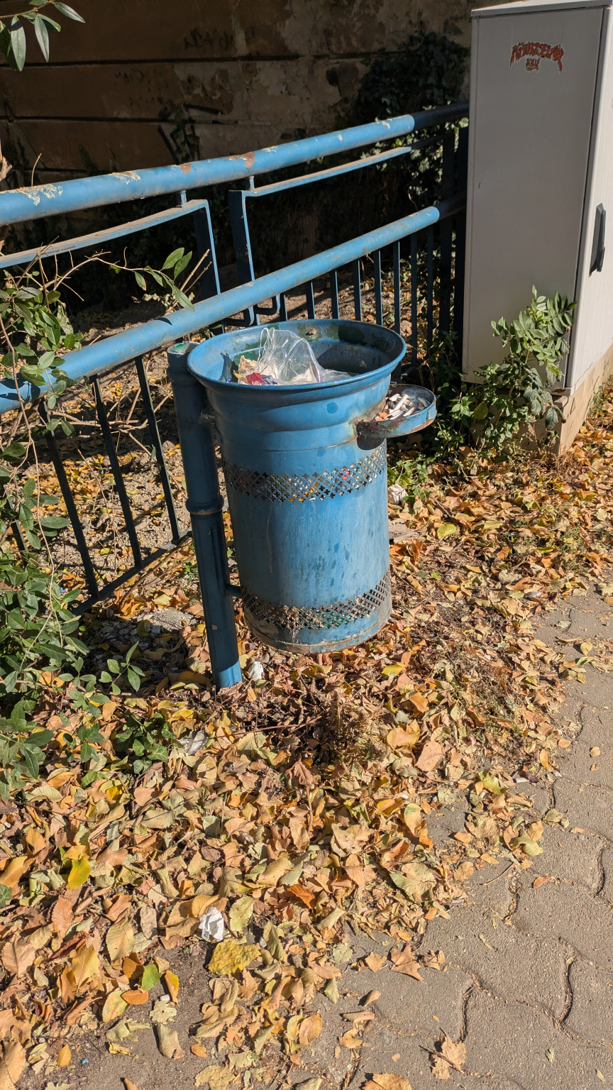 Most azonban a Temes utcai lepcső tetején lévő szemetes tetejét tartó rúd el lett vágva, az a szemetes mögötti korlát mögött a földön hever a szemetes tetejével.