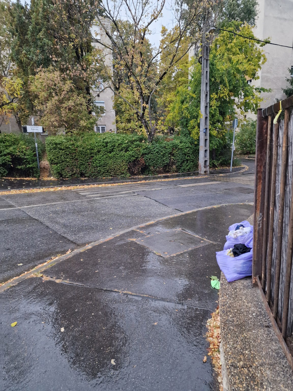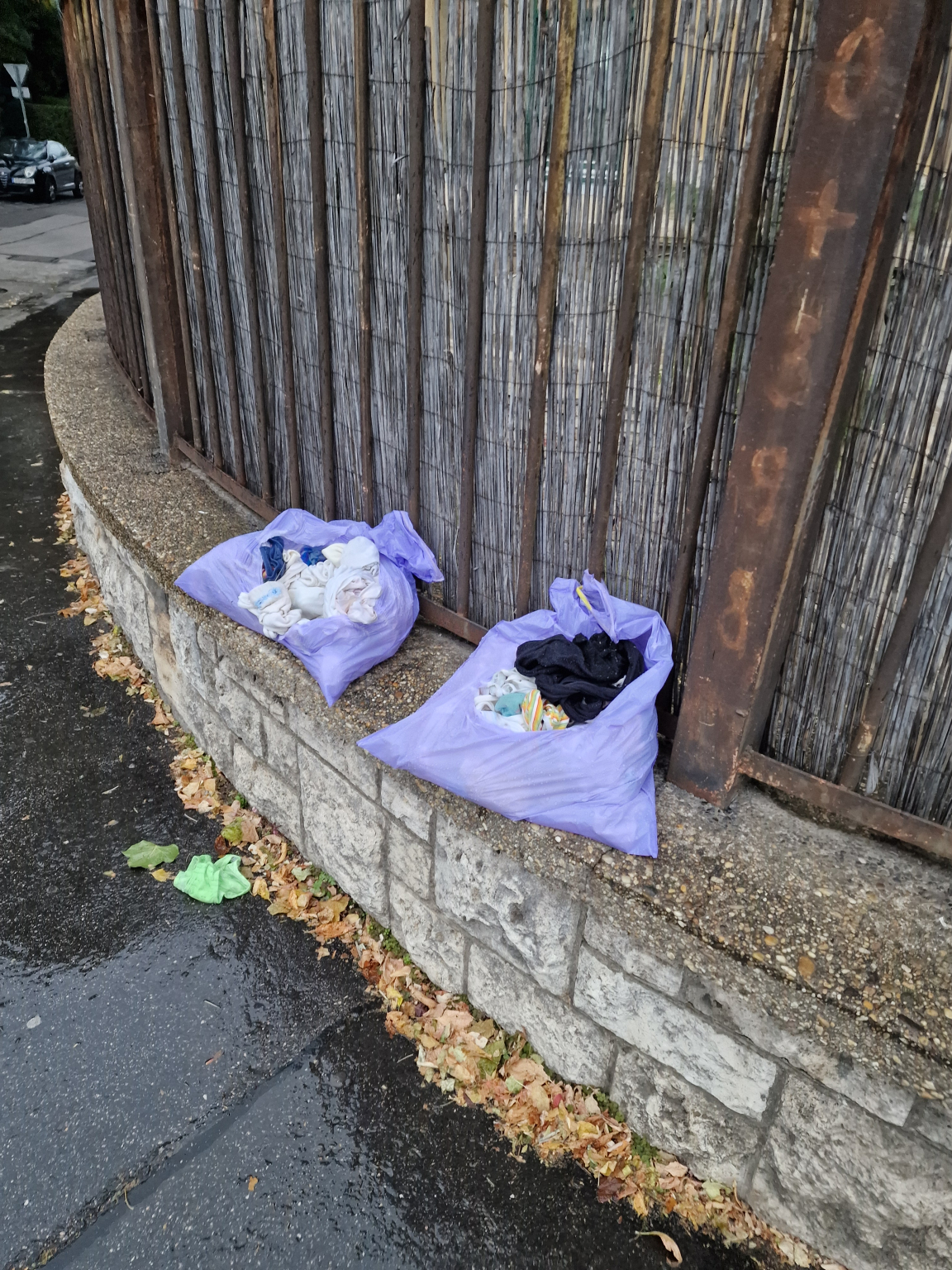 Két zsák ruha ázik az esőban a Budaörsi út 101-nél.