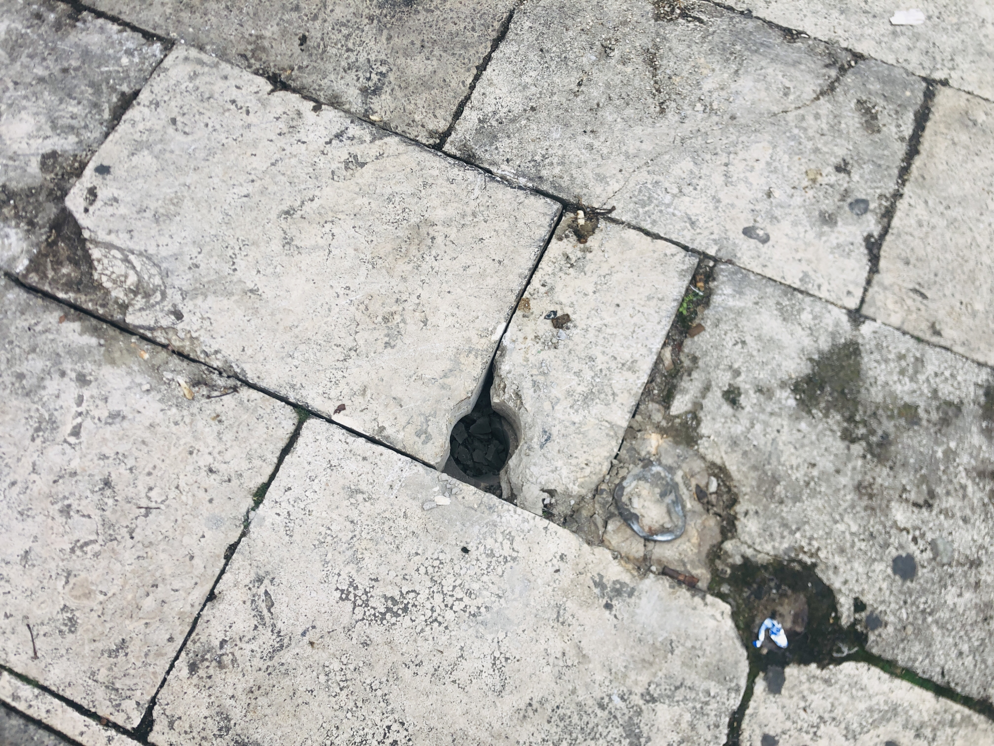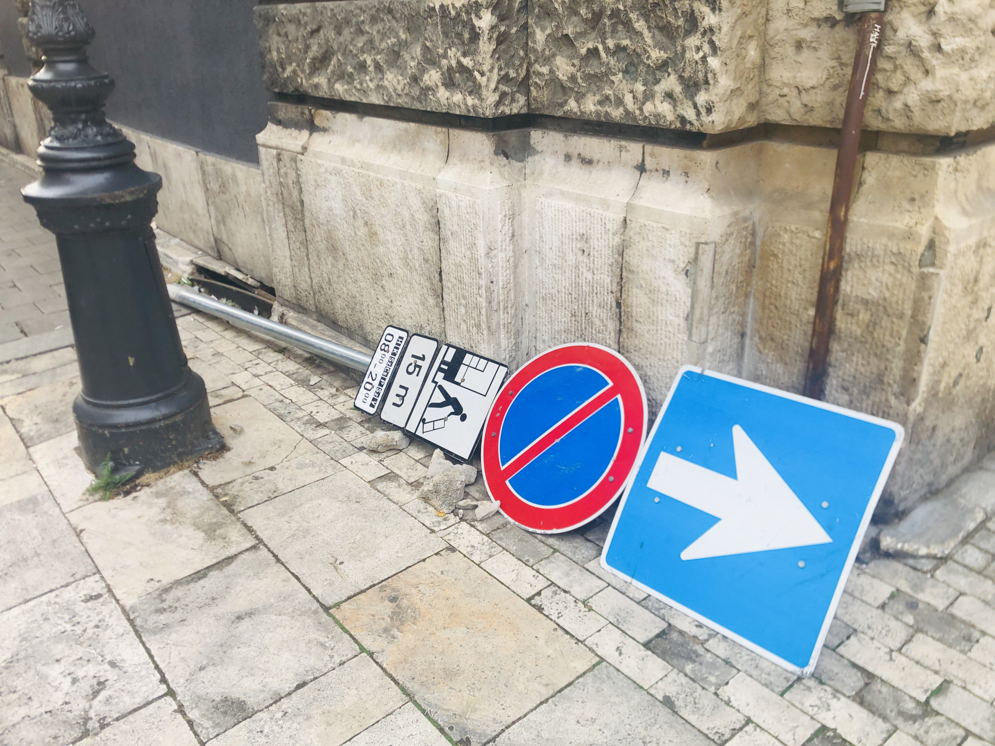 Nincs a helyén a KRESZ táblákat tartó oszlop, az épület mellé van lefektetve. A talapzat ingatag, mivel a járólap mozog, aminek tartania kéne az oszlopot, kérem, hogy helyezzék vissza az oszlopot.
