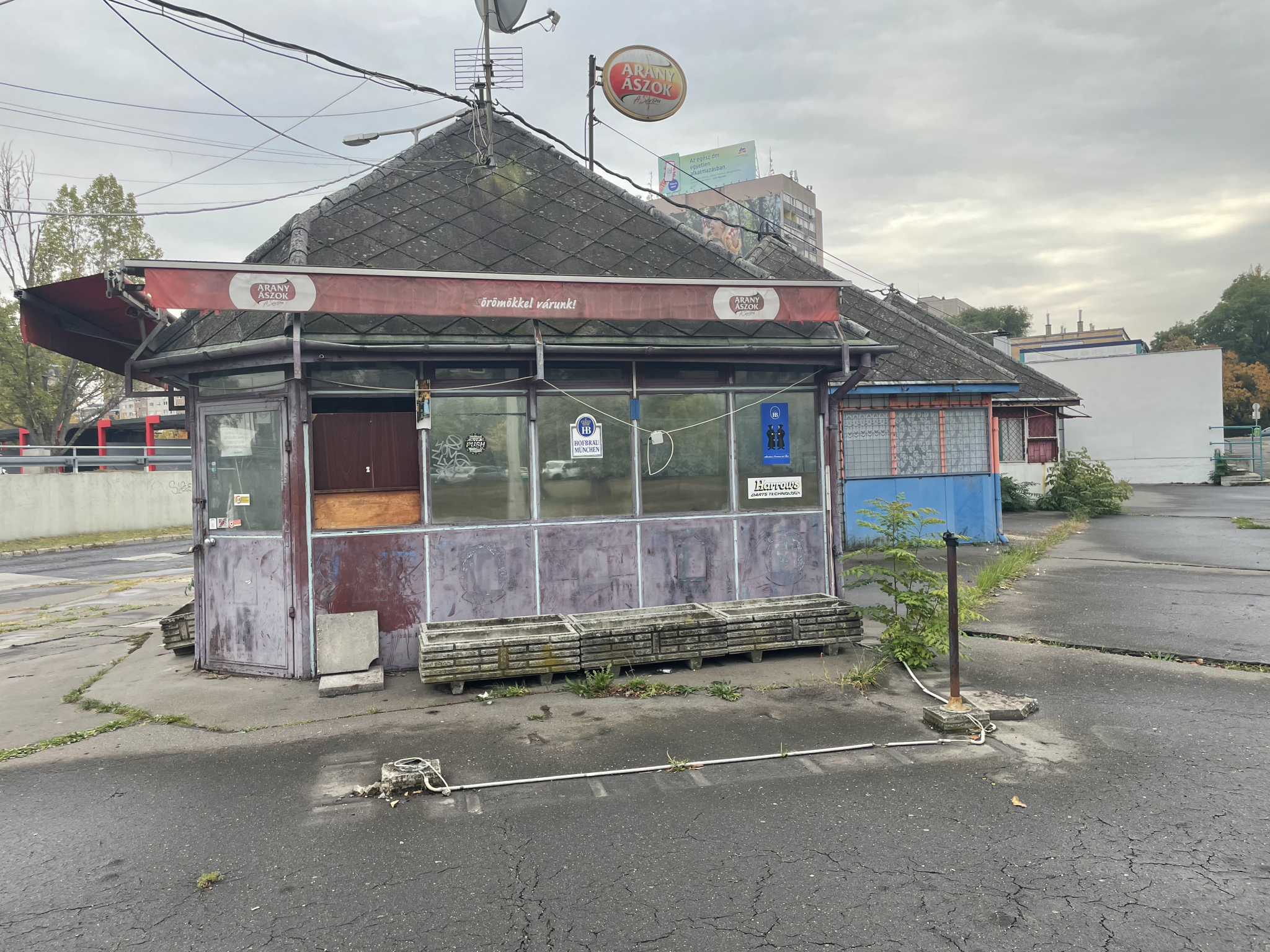 Elhagyott, koszos bódék csúfoskodnak Óbudán, a Bogdáni út buszvégállomásnál. Többet fel is törtek, ezekben áll a szemét. Fekália, vizeletszag terjeng.