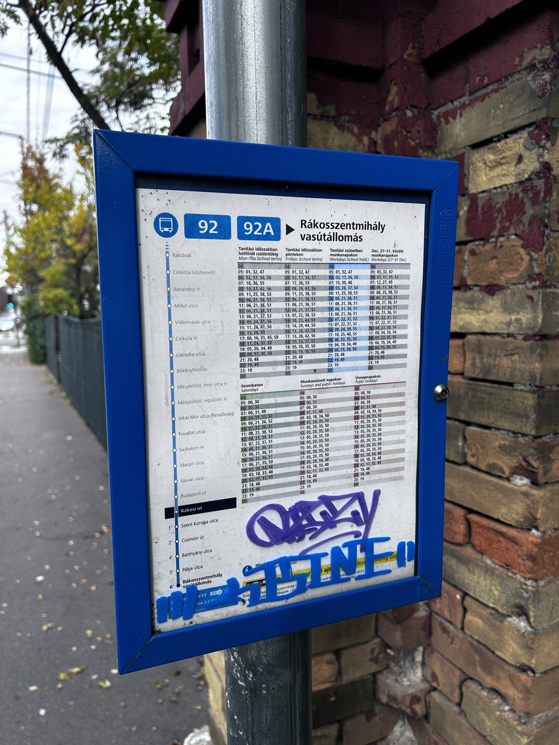 A Rákosi úton, a 92/92a menetrend tàblája össze van firkálva