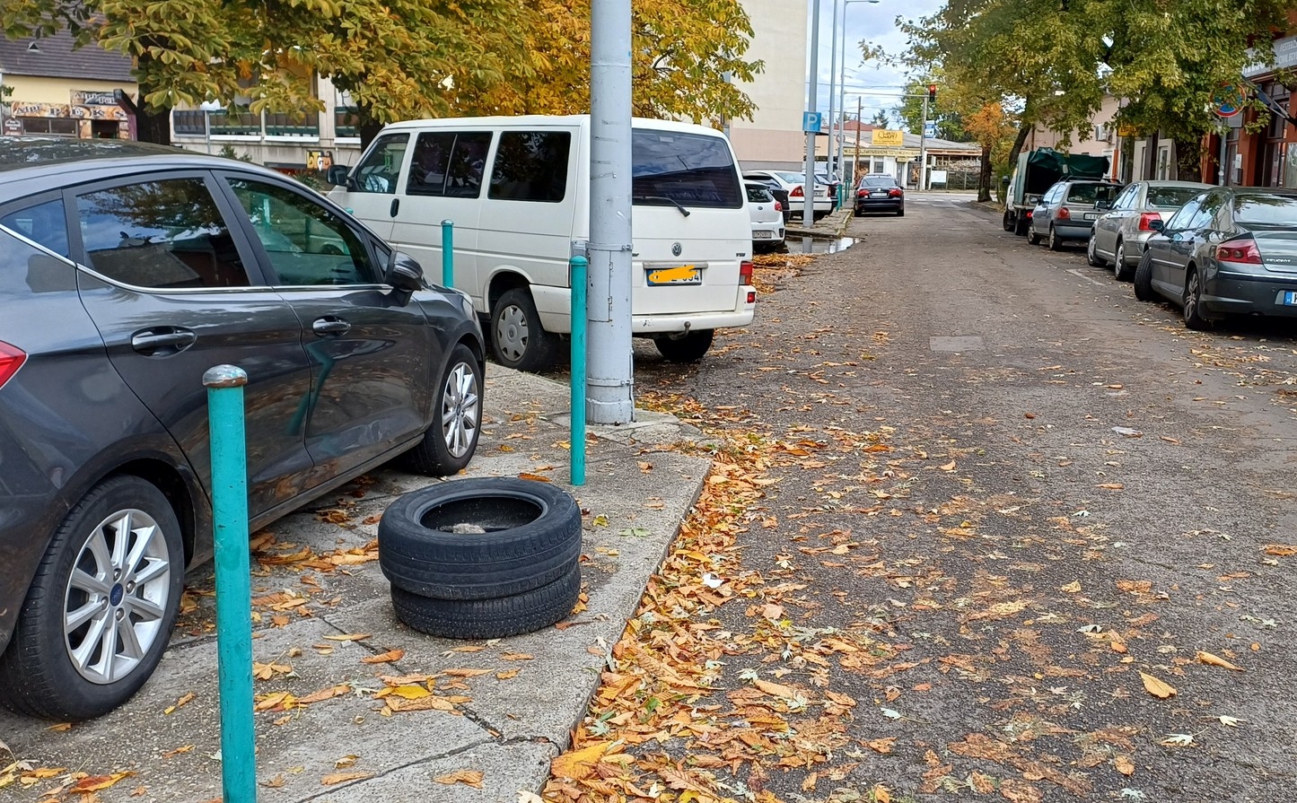 Két autógumi, bennük betontörmelékkel a Szivacs utca bal oldalán.