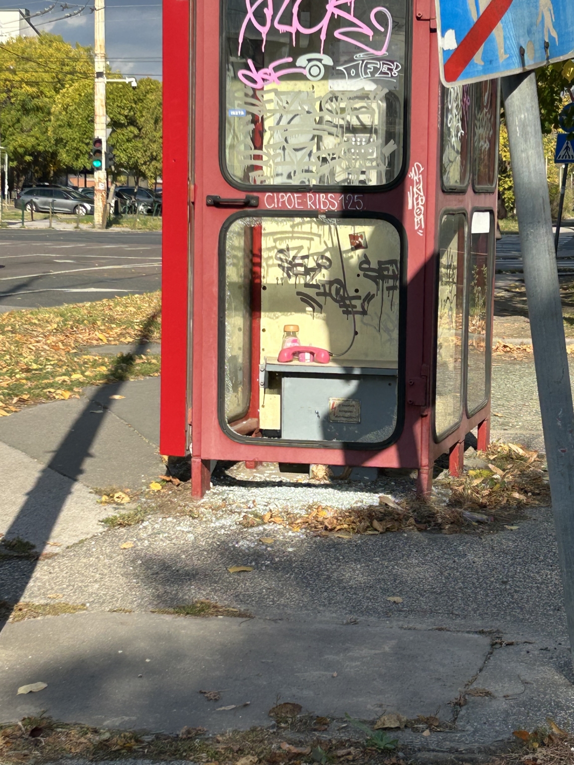 Nagyon megrongált telefonfülke, ezért minden tele van apró üvegszilánkokkal