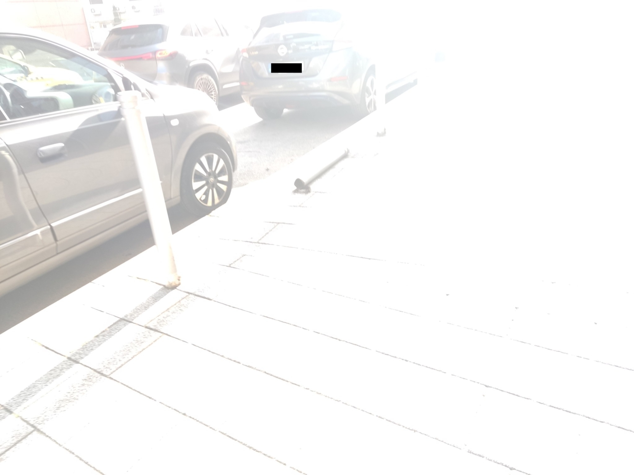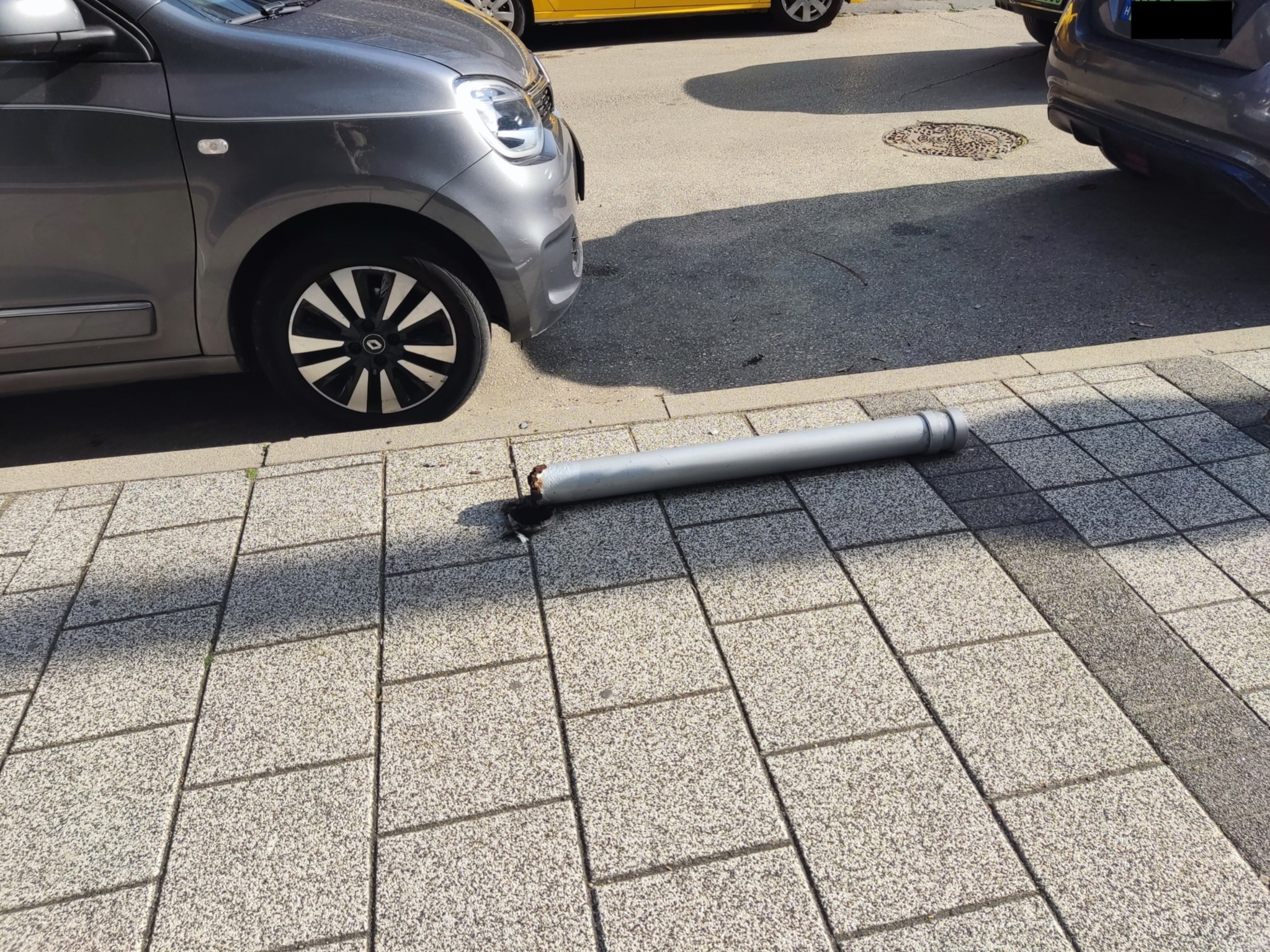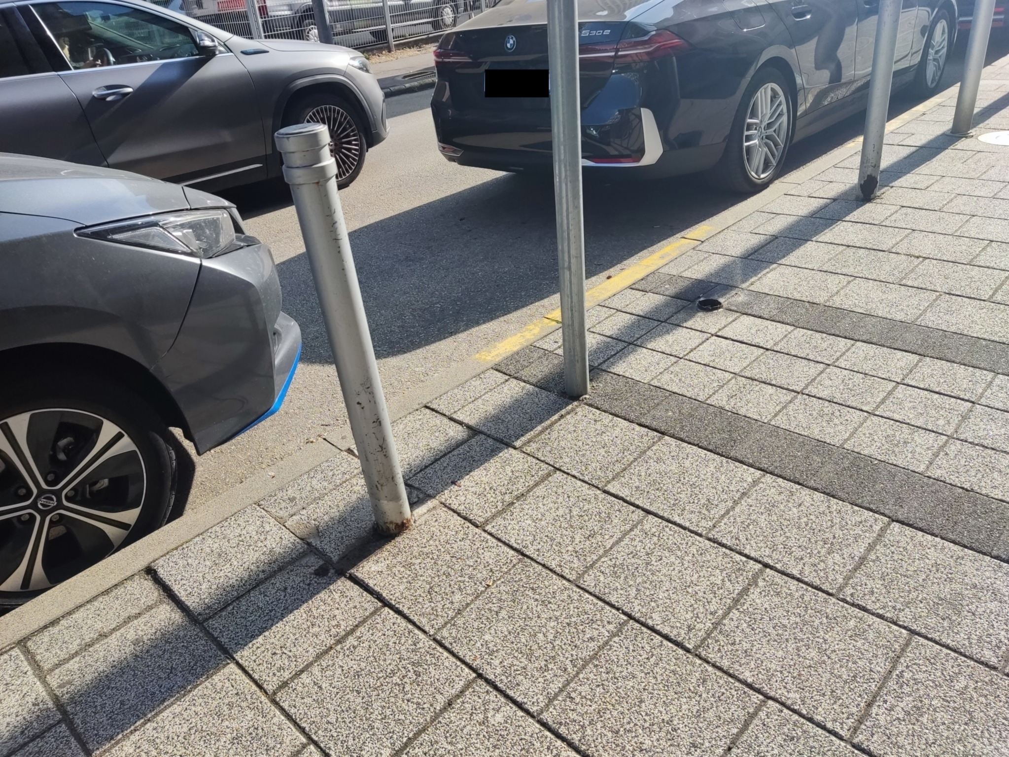 Hiányzó pollerek, 2 db, az egyik frissen dőlt ki, korrodált állapotú valamennyi.