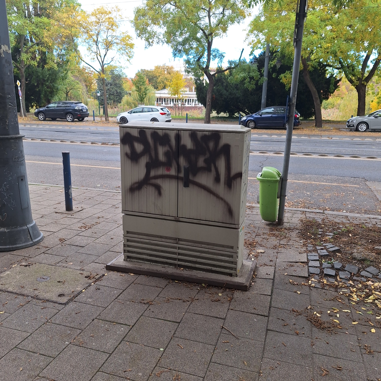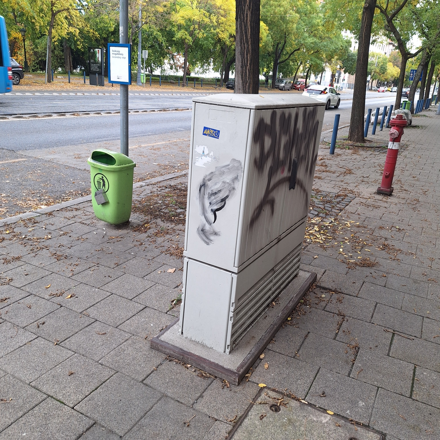 Szét graffitizott BKK szekrény van a Bartók Béla út 78. (1114) szám alatt.