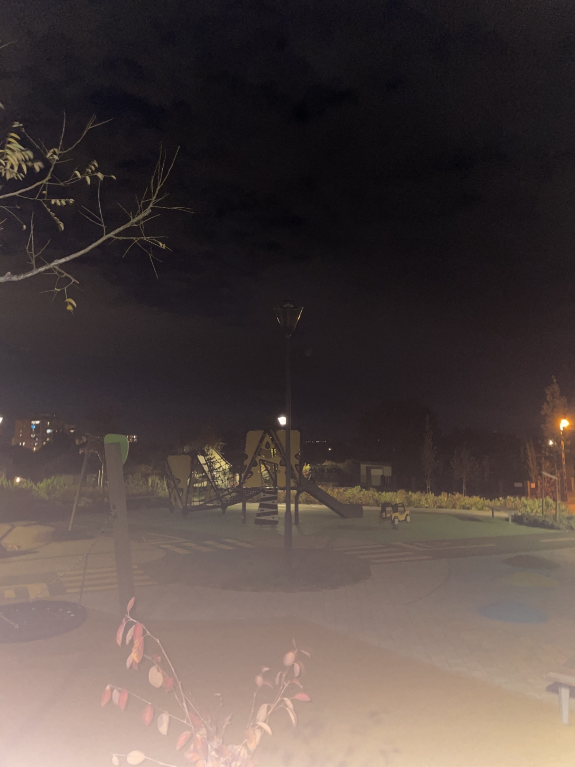 A cséplő parkban a kresz pályánál kivan égve egy lámpa a fészekhinta mellett.